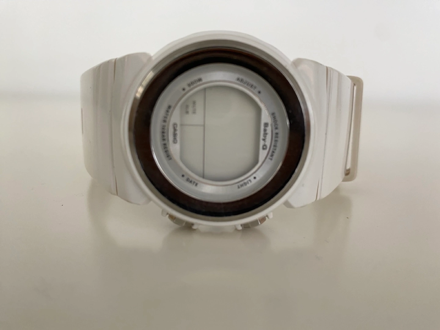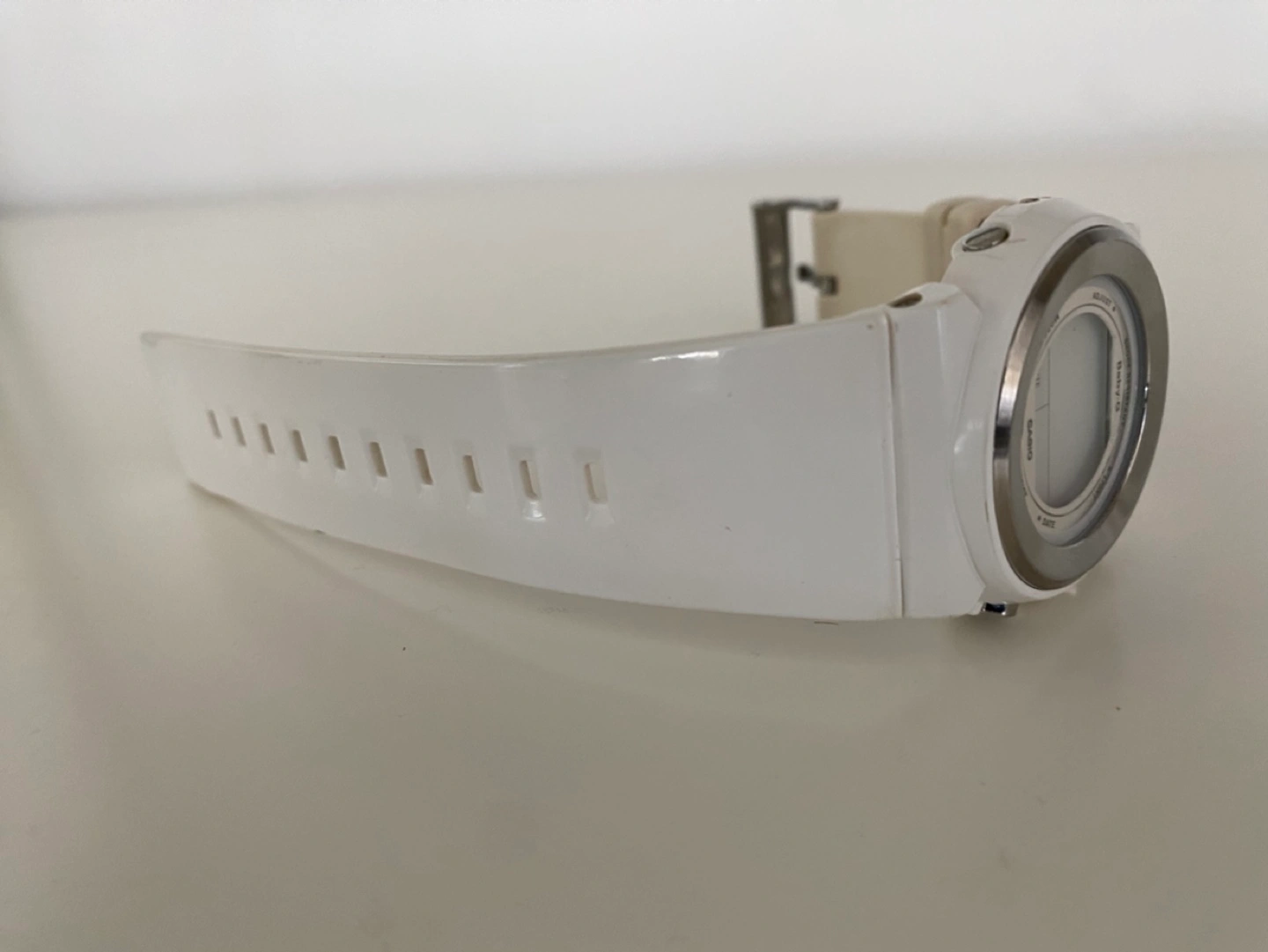 Pre-owned Casio Baby-G watch. White colour, digital display. Features include light, stopwatch, and alarm. Features a comfortable white resin band. Water resistant.