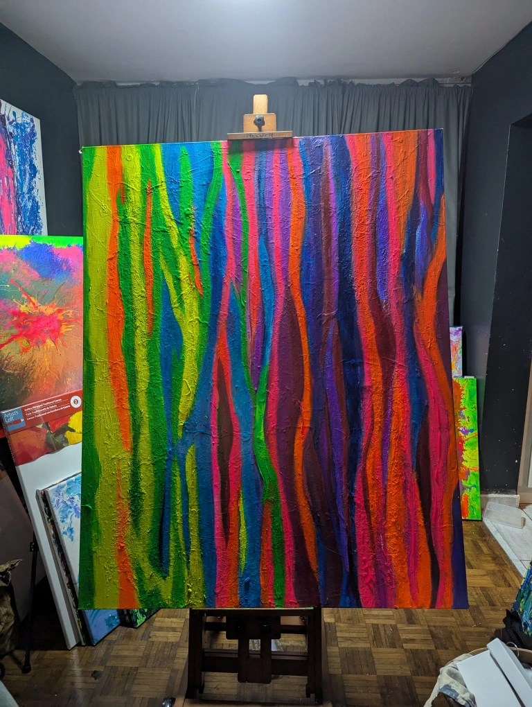 Vibrant colours, textured paint. Large format canvas. Unique piece. Glows under UV light. Original artwork, not a print. Local artist Orfeo D Pagliacci