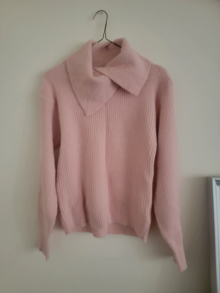 Soft peach pink sweater, ribbed fuzzy knit. Features a wide, folded collar.