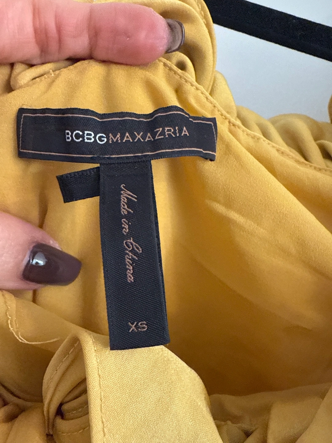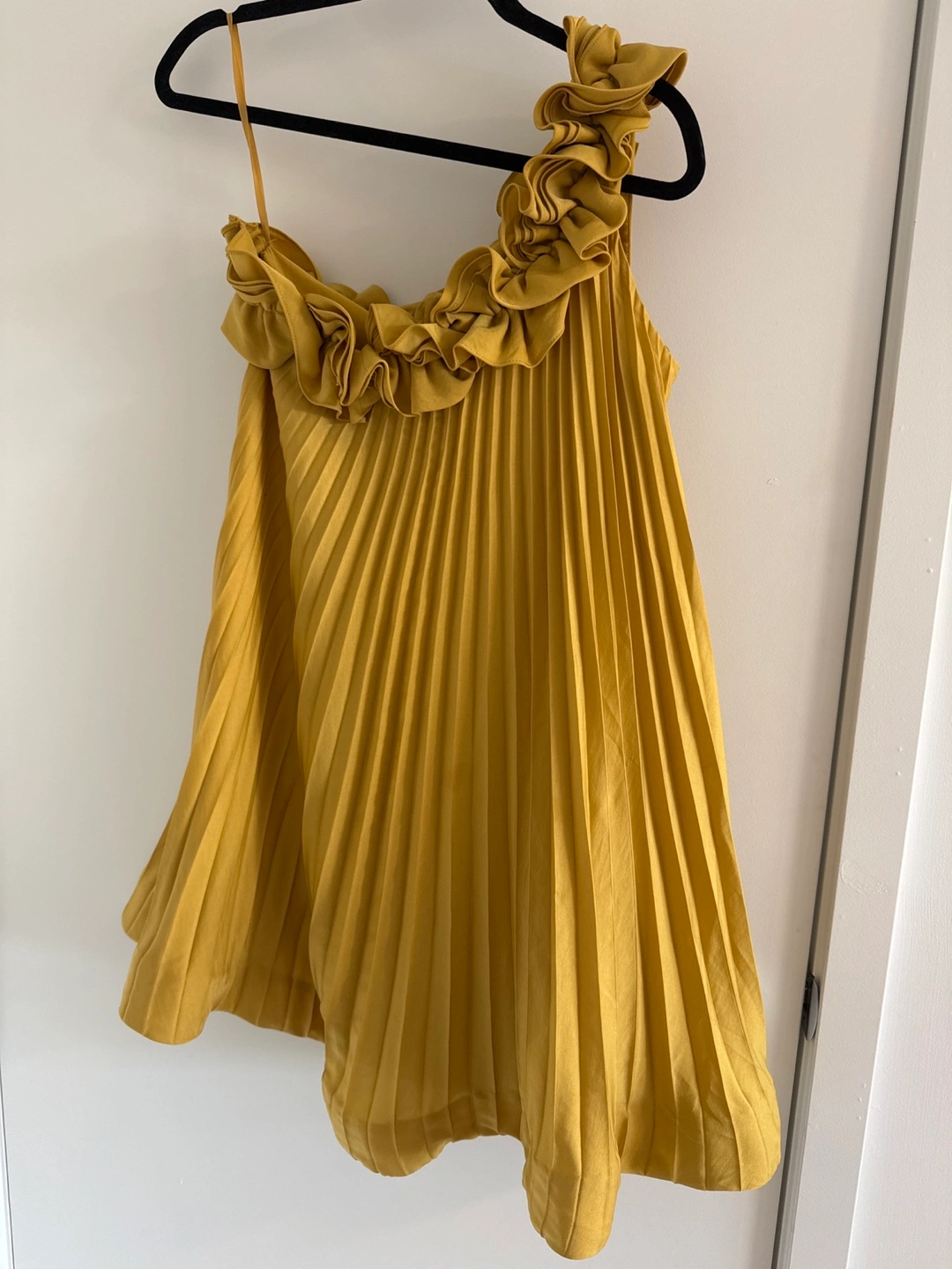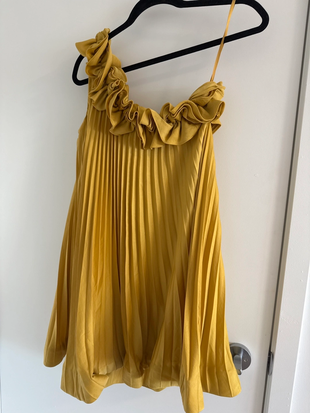 96Gorgeous mustard yellow mini dress. One-shoulder design. Pleated fabric. Floral ruffle detail. Size extra small.