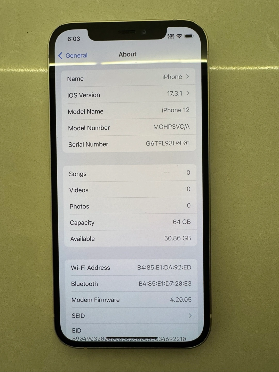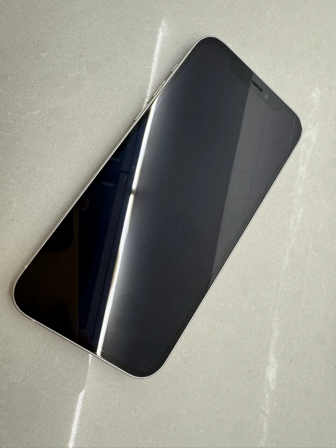 Used iPhone 12, 64 GB storage. White colour. Screen is good, no major scratches, minor cosmetic damage on back, upper right hand side. Battery health at 87%.