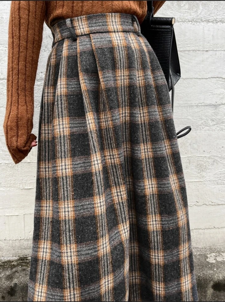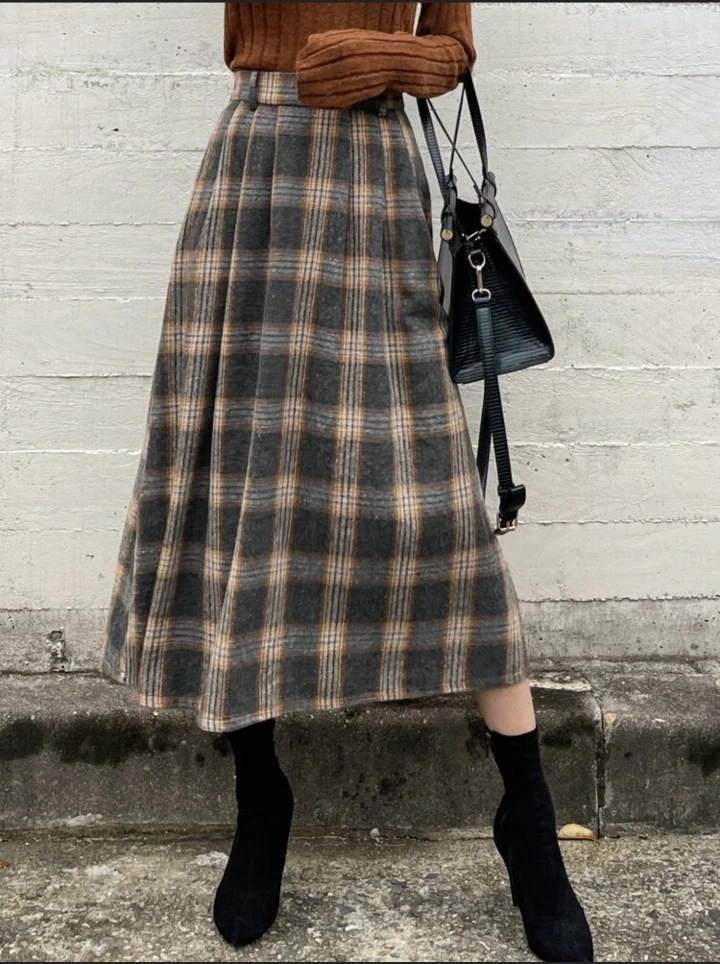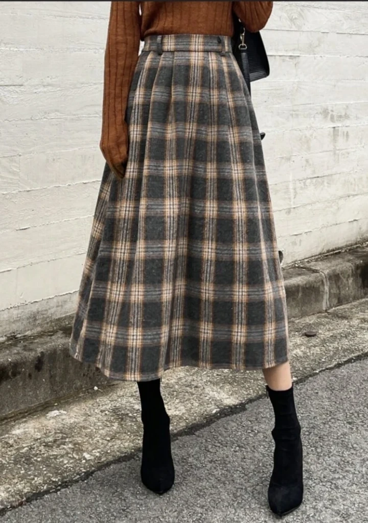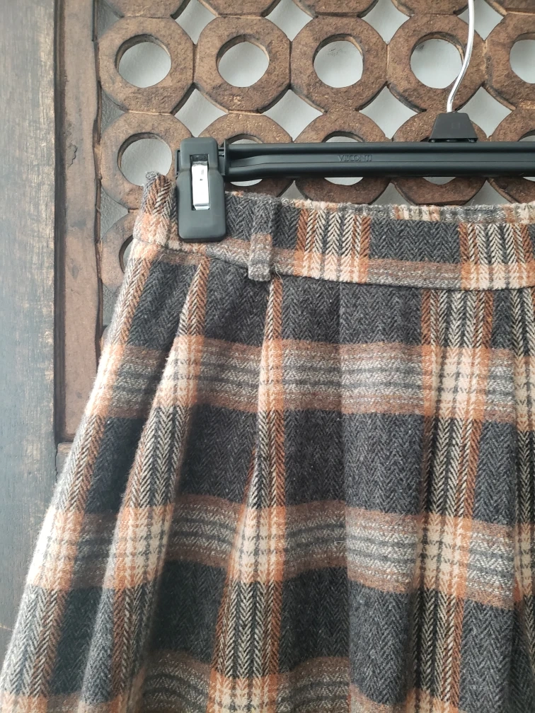 1000+High waisted A-line skirt. Pleated. Grey, orange and beige plaid pattern. Woven fabric. Mid-length.