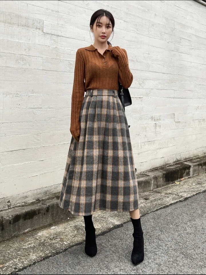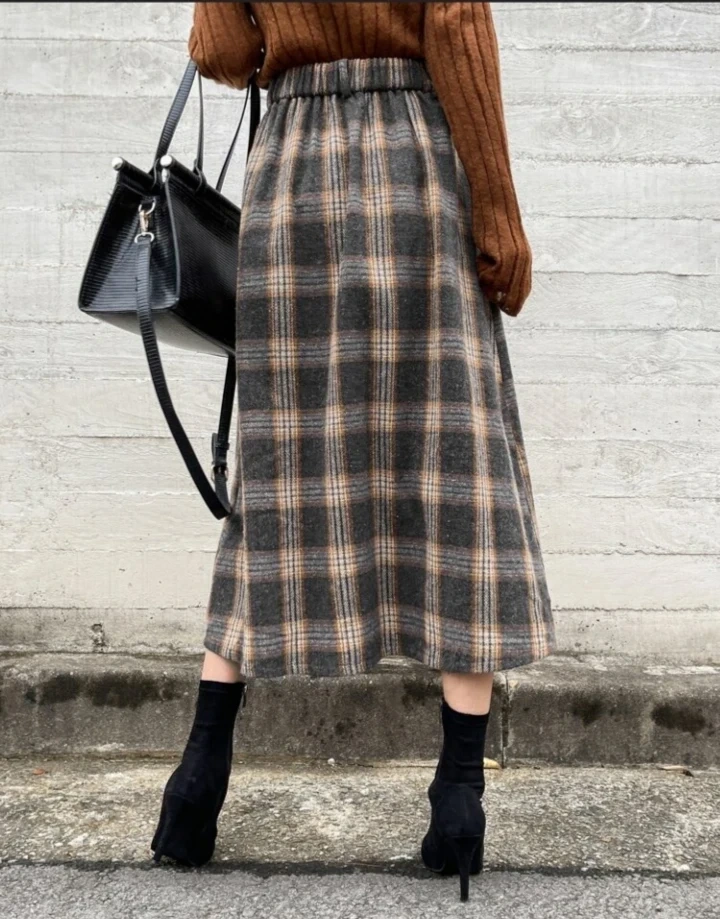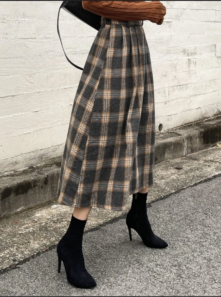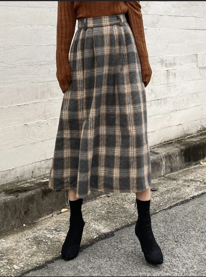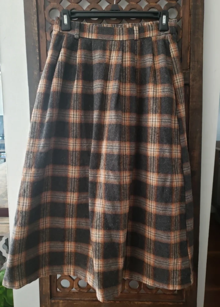 1000+High waisted A-line skirt. Pleated. Grey, orange and beige plaid pattern. Woven fabric. Mid-length.