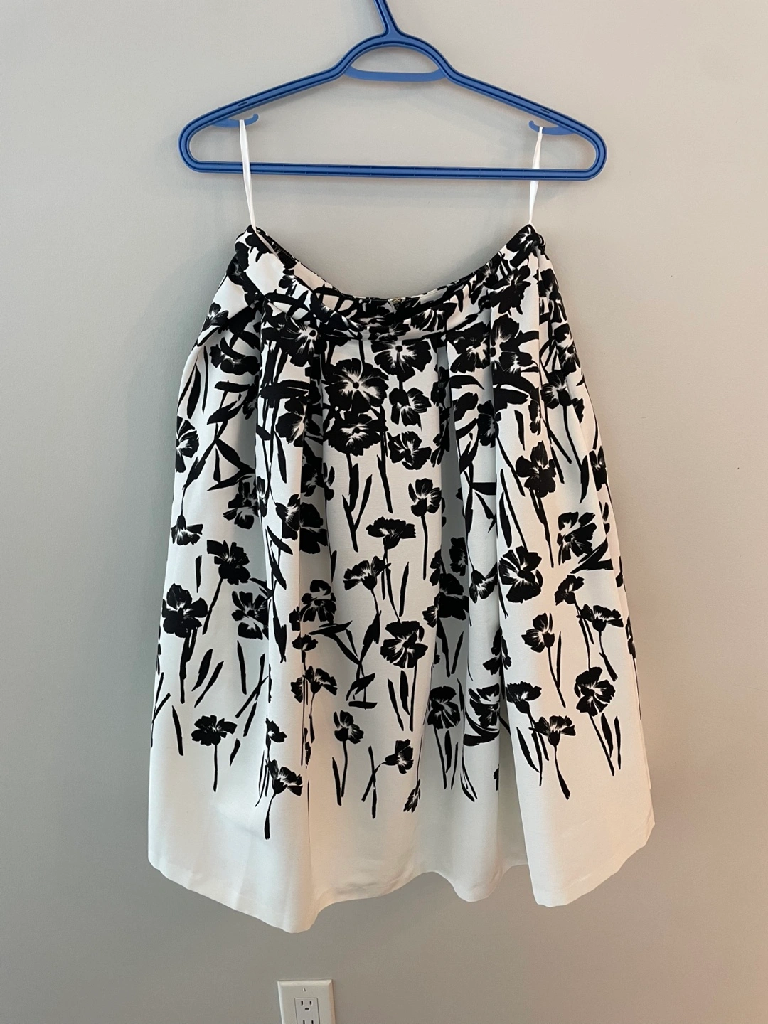 A-line skirt. Black and white floral print. Back zipper closure. Size 6.