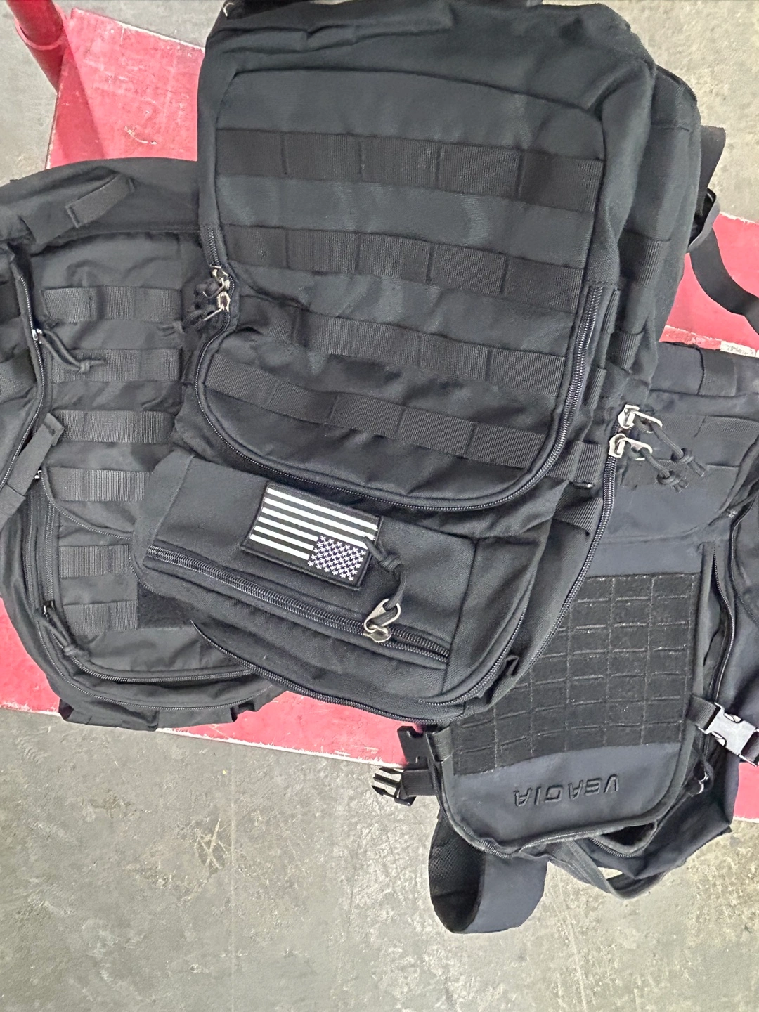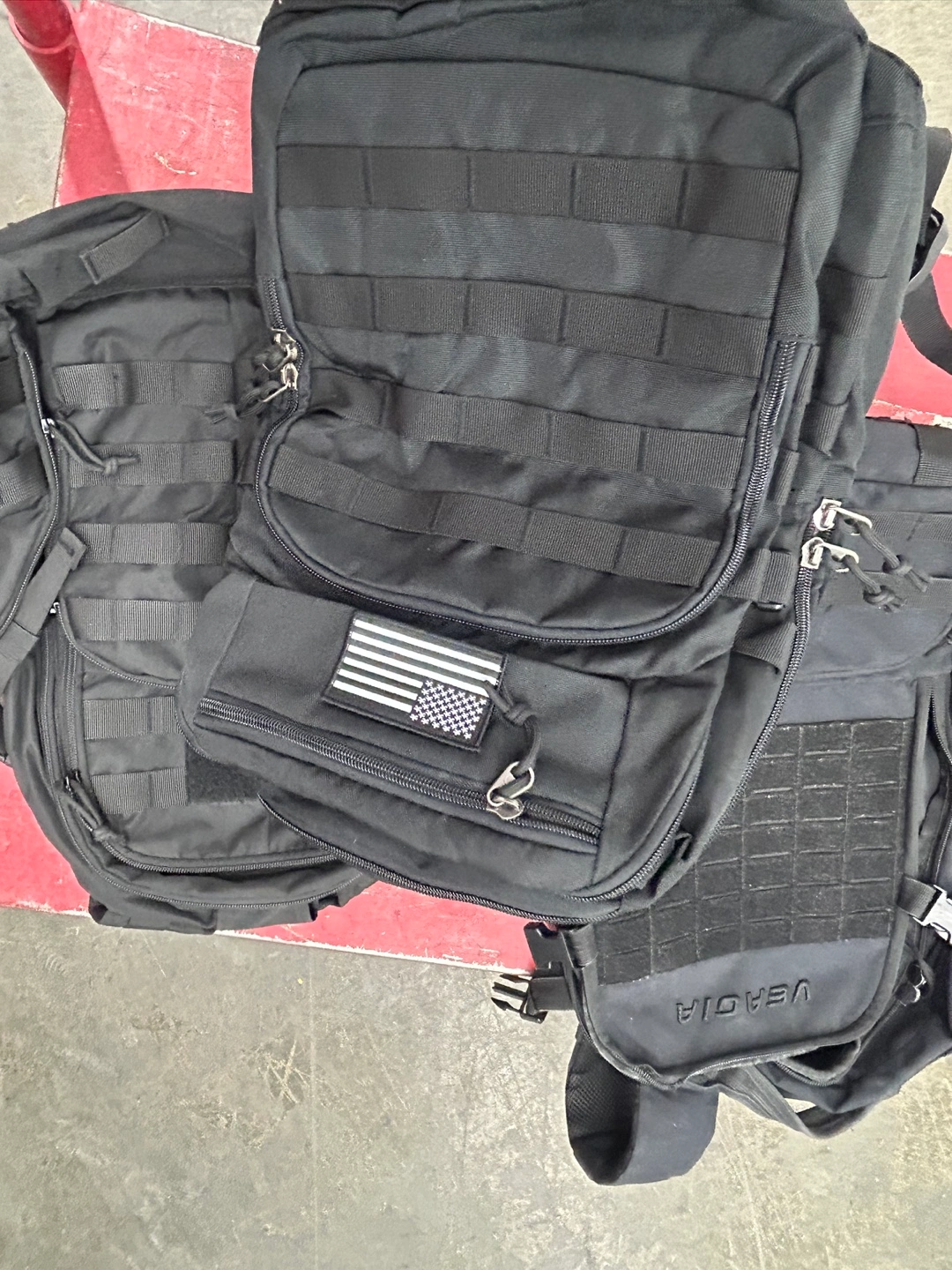 Black tactical backpack. Multiple pockets and compartments. Durable construction. Great for everyday use or outdoor activities. $25 each