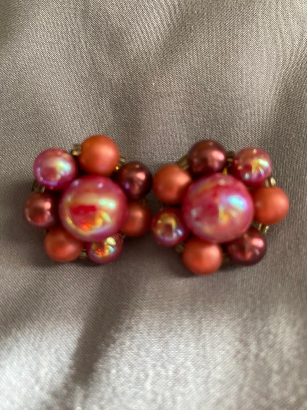 Pretty vintage clip-on earrings. Features pink and orange beads. Unique design. (Japan)