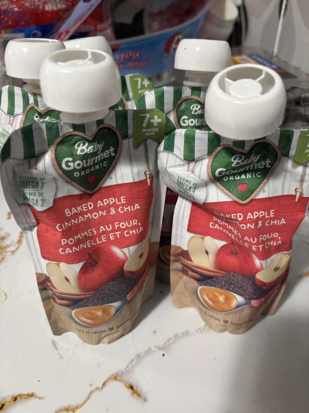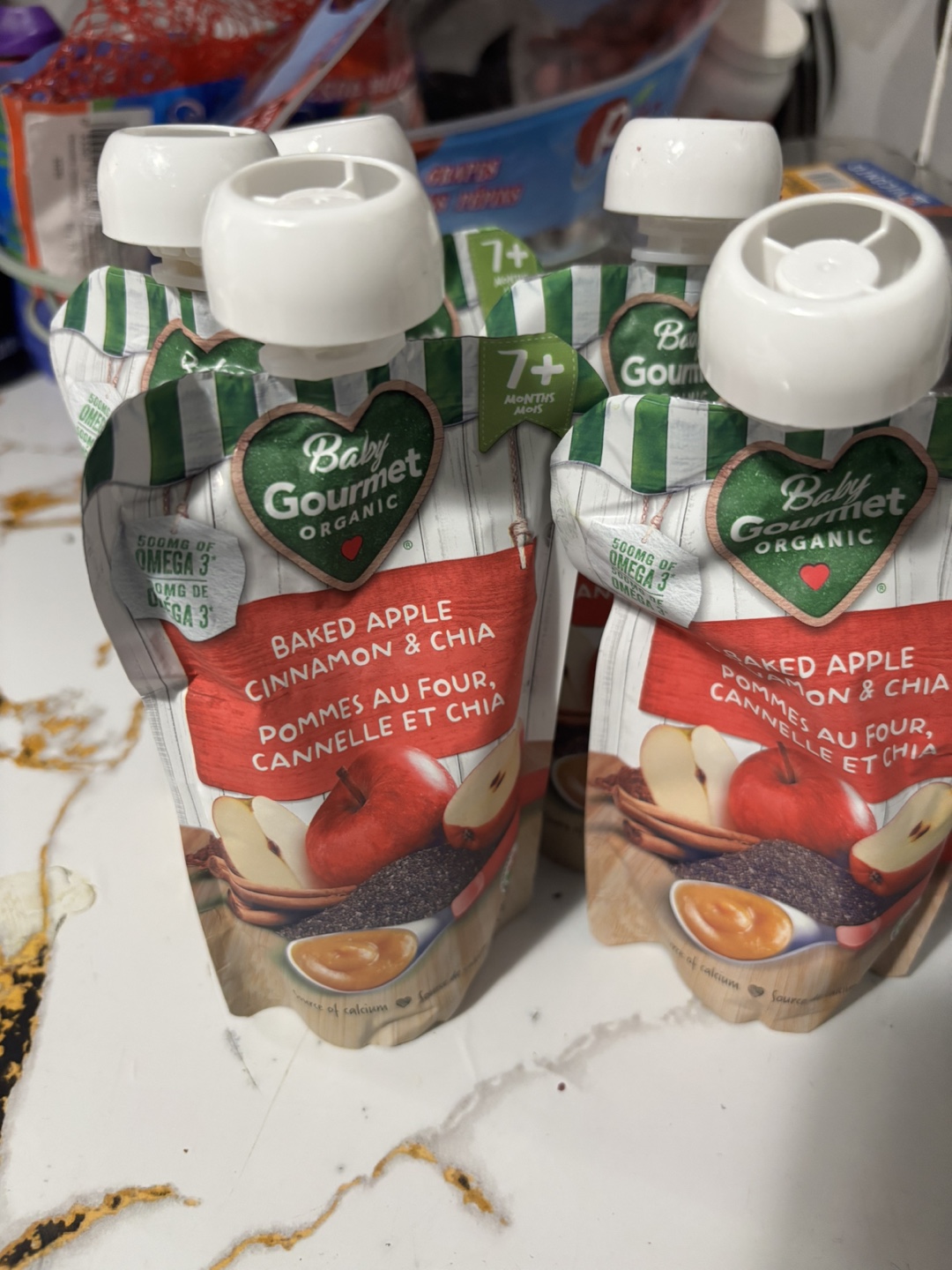 Four pouches of Baby Gourmet Organic Baked Apple Cinnamon & Chia baby food. Seven months+. Source of calcium and omega-3.I gave it bcz my baby didn’t like the taste of cinnamon