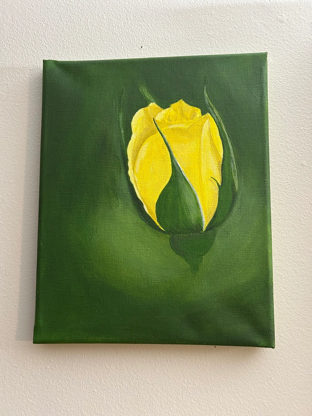 Small canvas painting of a yellow rose. Green background. Unique artwork, perfect for a small space.