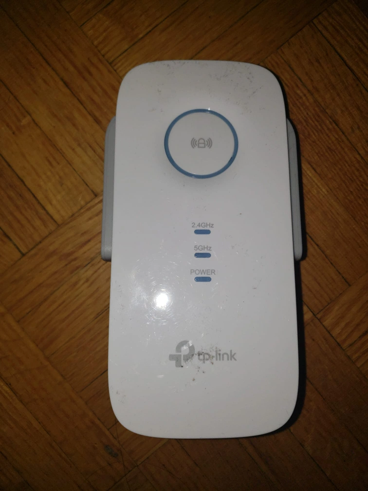 Used TP-Link WiFi range extender. White plastic casing. Shows some minor cosmetic wear. Features 2.4GHz and 5GHz bands. Includes power indicator.
