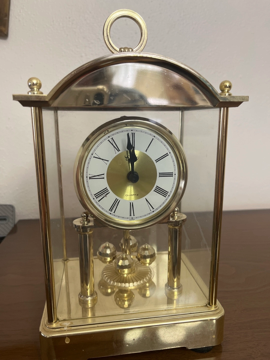 Gold-toned brass mantel clock. Quartz movement. Plastic enclosure. Roman numerals. Made in Korea.