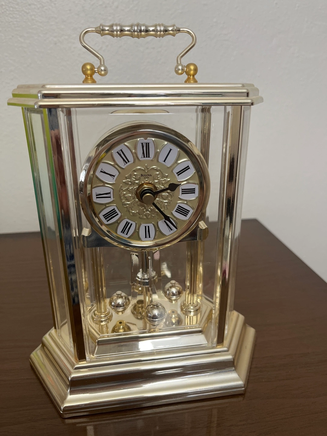 Vintage Bulova clock. Gold-tone finish. Acrylic casing. Pendulum movement. Great addition to any home.