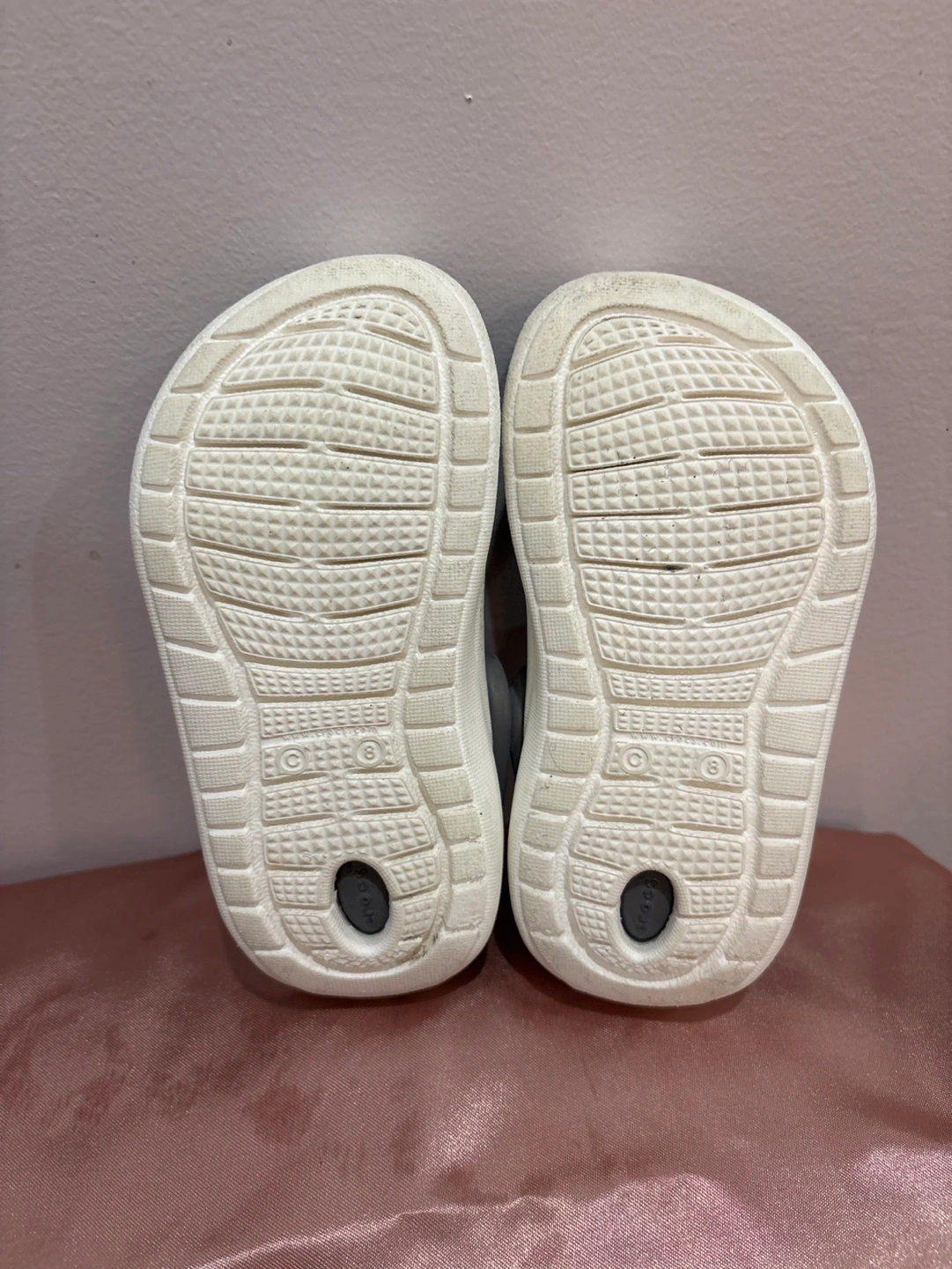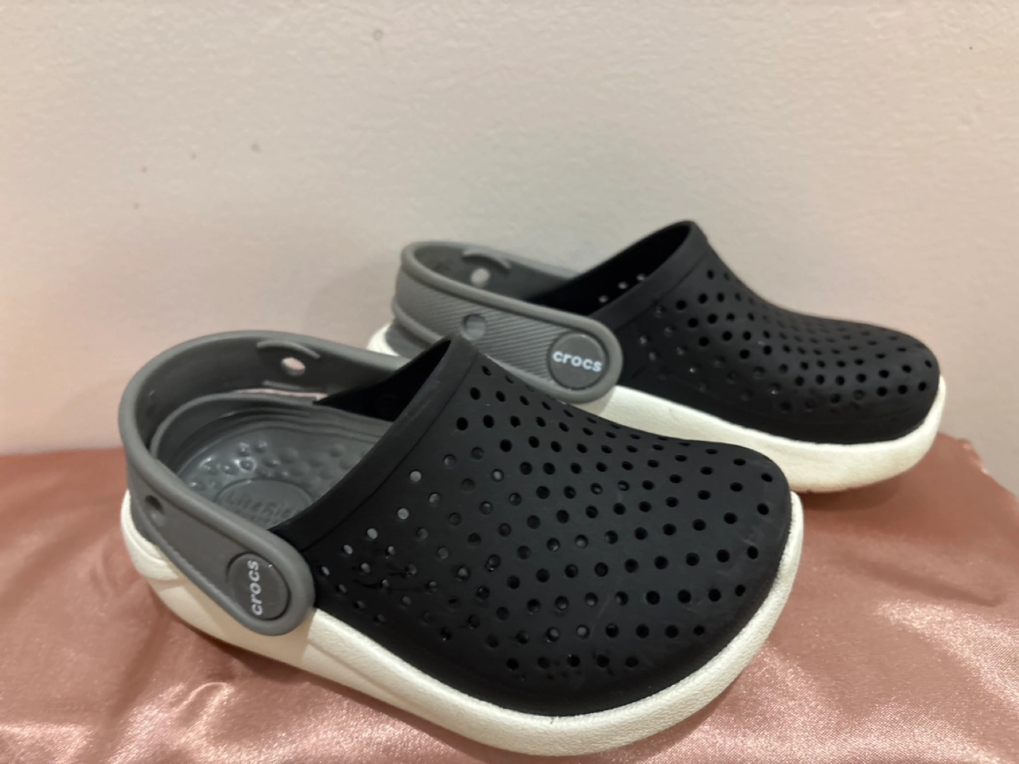 113Pair of Crocs LiteRide™ clogs. Black with grey accents. Size 8. Lightweight and comfortable.