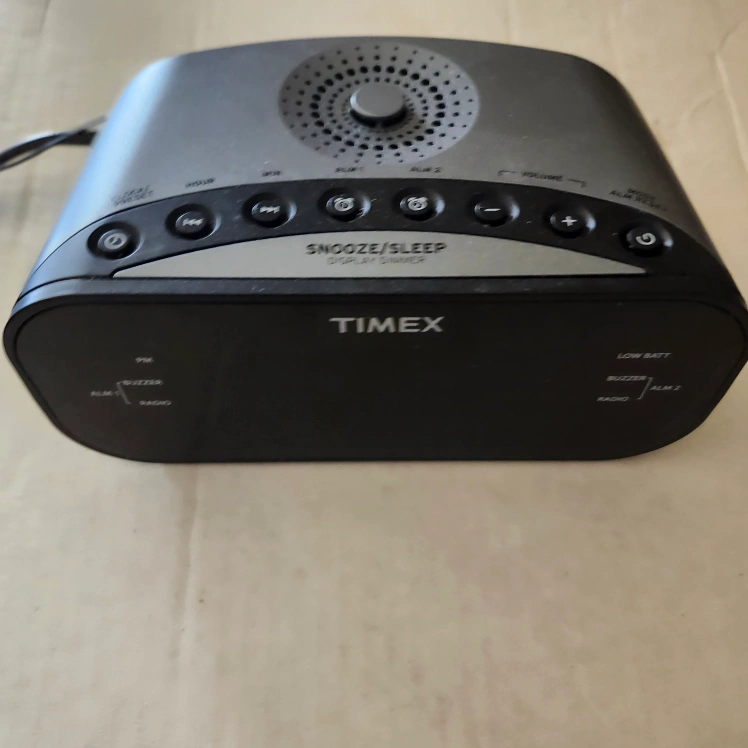 Timex digital alarm clock. Features snooze and sleep functions. Dual alarms. Radio and buzzer options.
