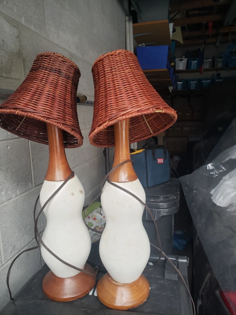 Unique pair of table lamps. Features a white ceramic base and brown wicker shades. Wooden accents. Excellent for a retro or vintage style home.