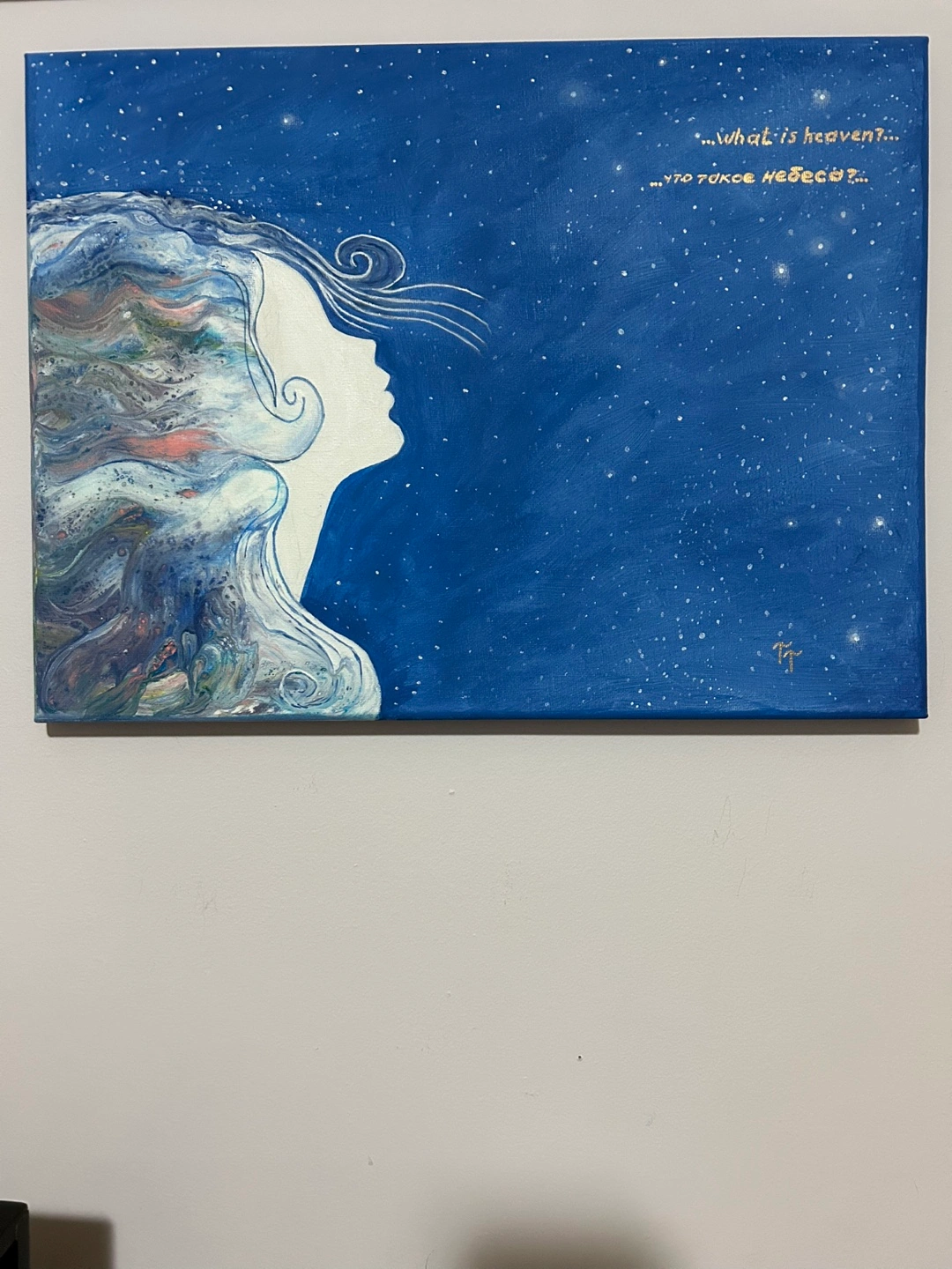 Canvas painting, fluid acrylic pour. Features a woman's face in profile against a starry night sky. Includes a quote in English and another language.