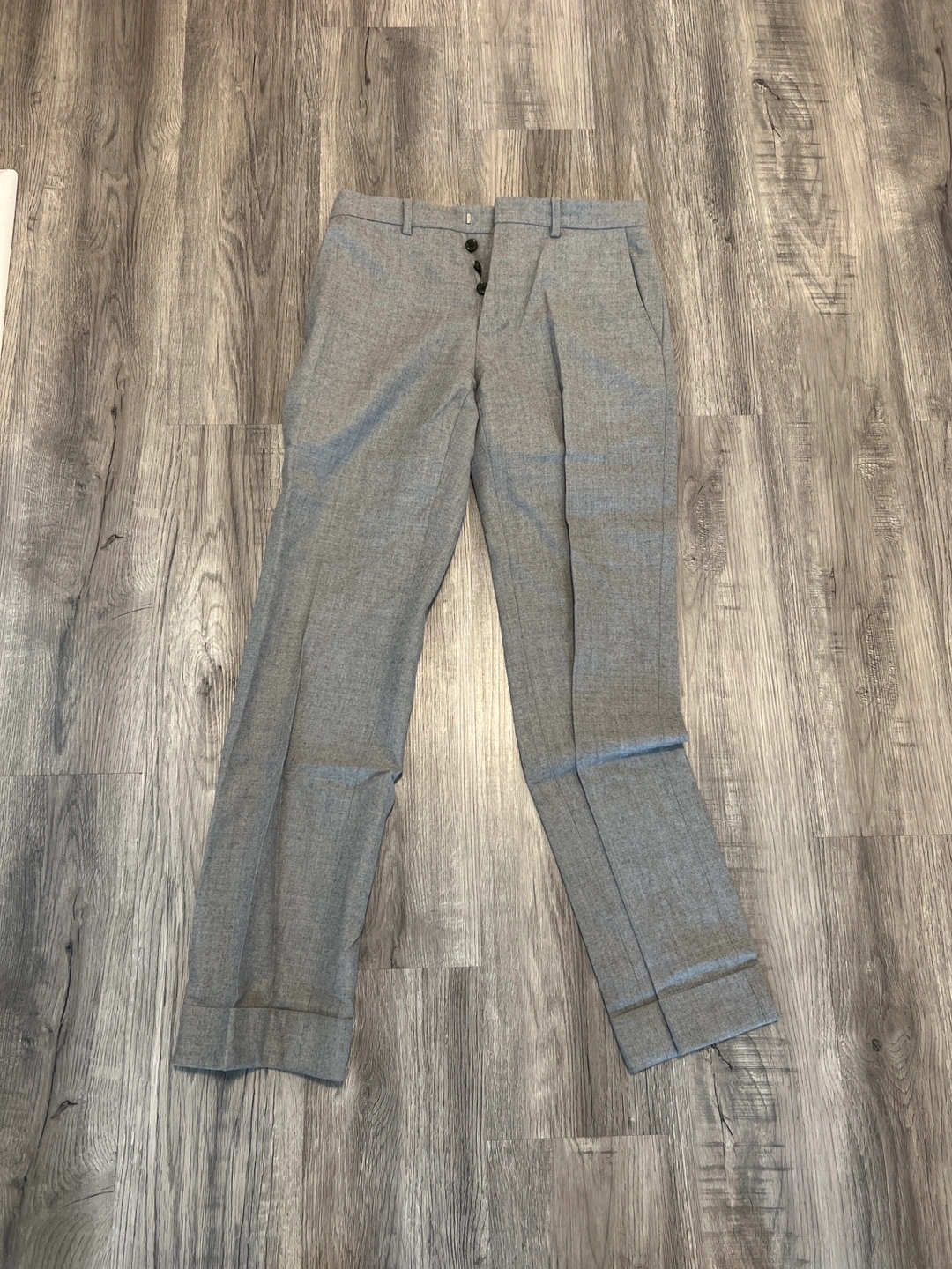 Grey wool trousers. Button fly. Straight leg. Cuffed hems. Size 28 x 30