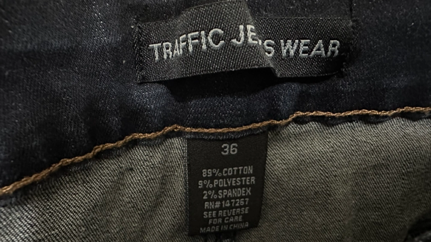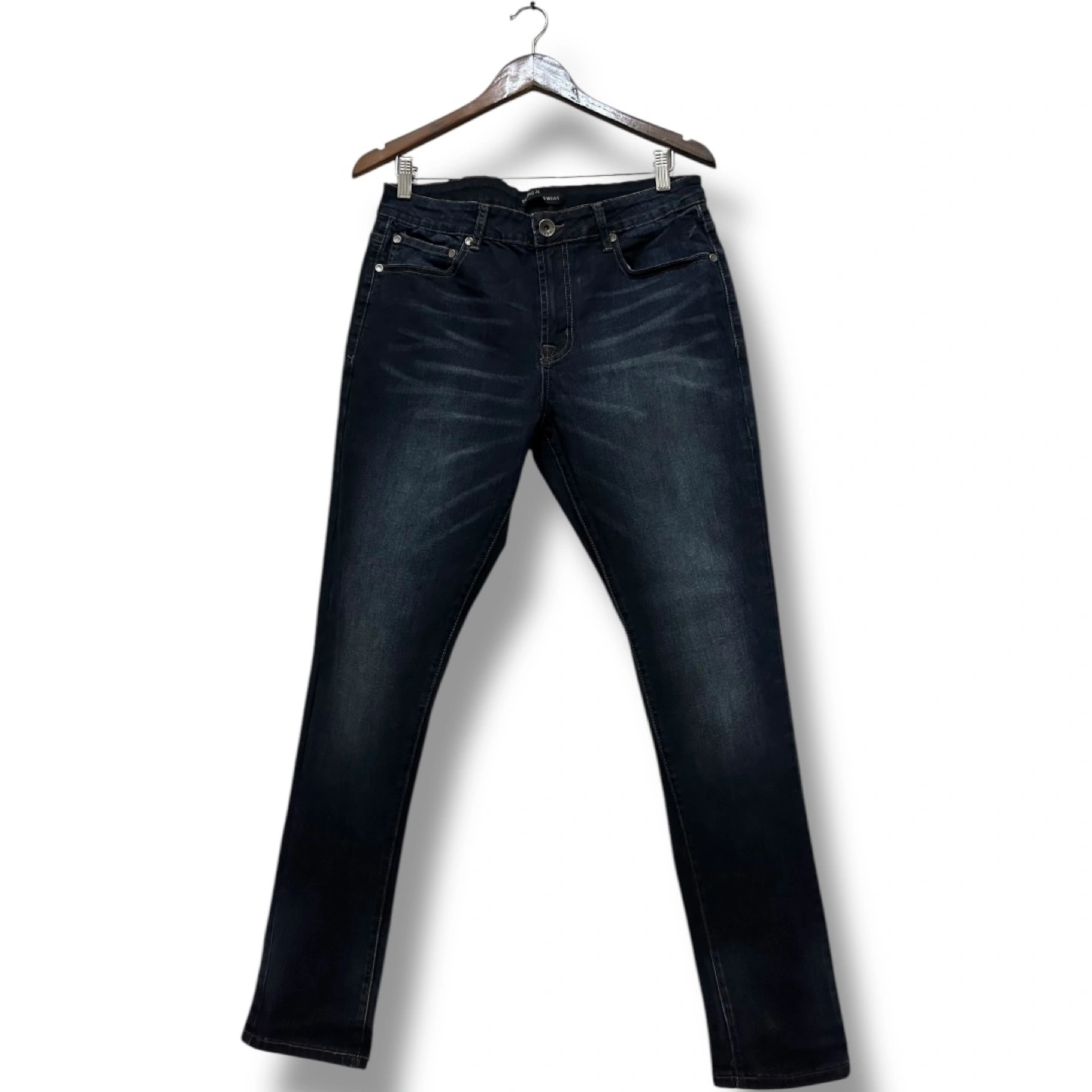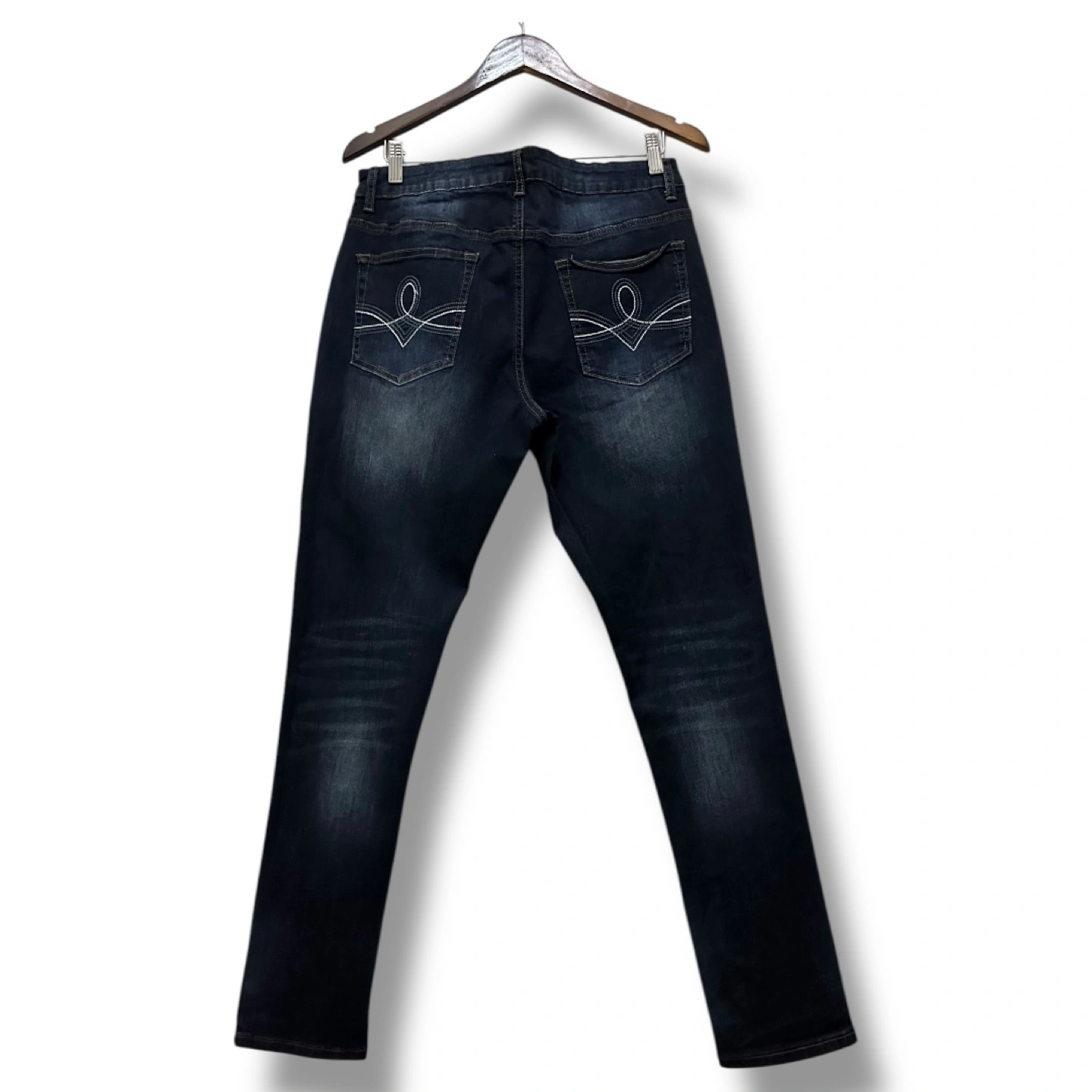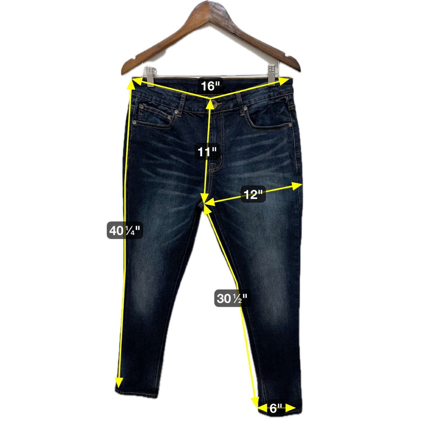 Men's dark wash straight leg jeans. Size 36. 9% polyester, 2% spandex. Made in China. Measurements provided in images.