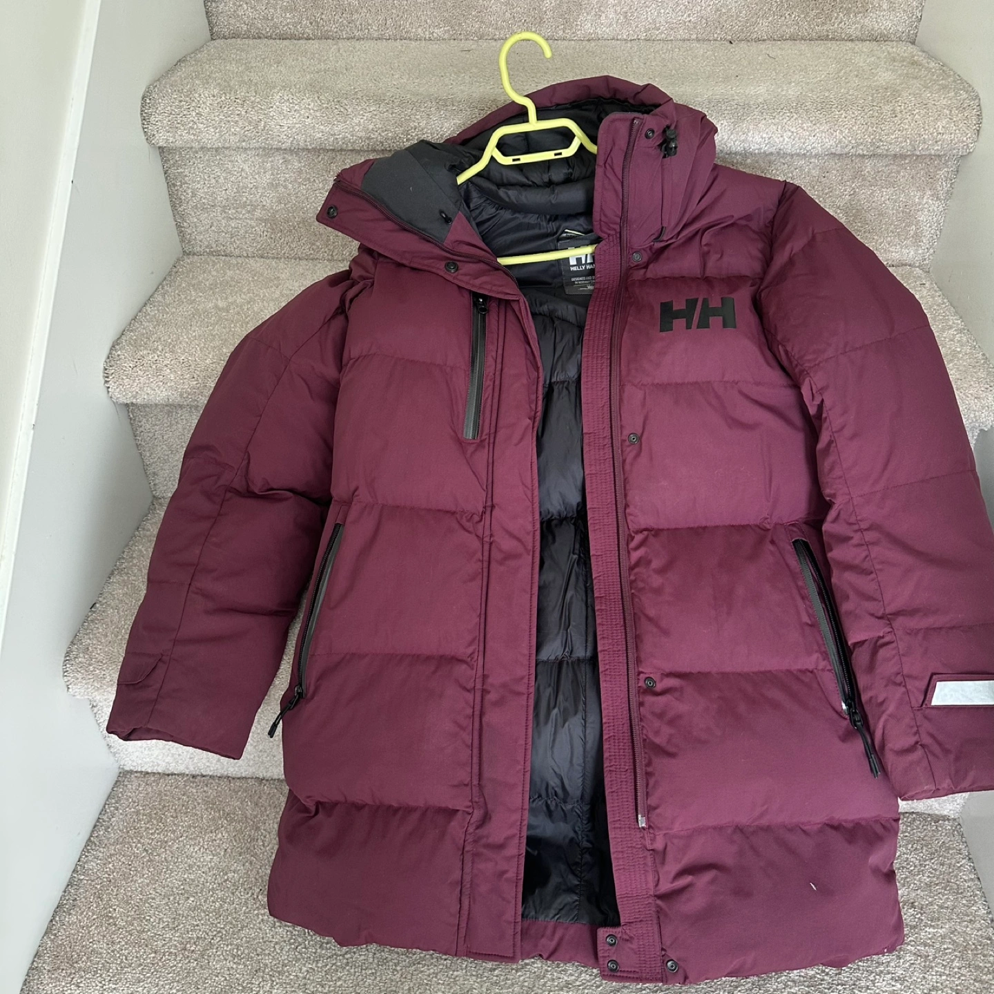 64Women's long down parka. Burgundy colour. Zip up front, hooded. Multiple pockets. Excellent condition.