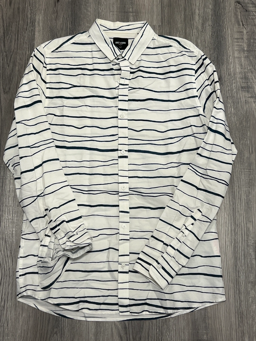 Men's long sleeve button-down shirt. White with black horizontal stripes. Long sleeves Size large.