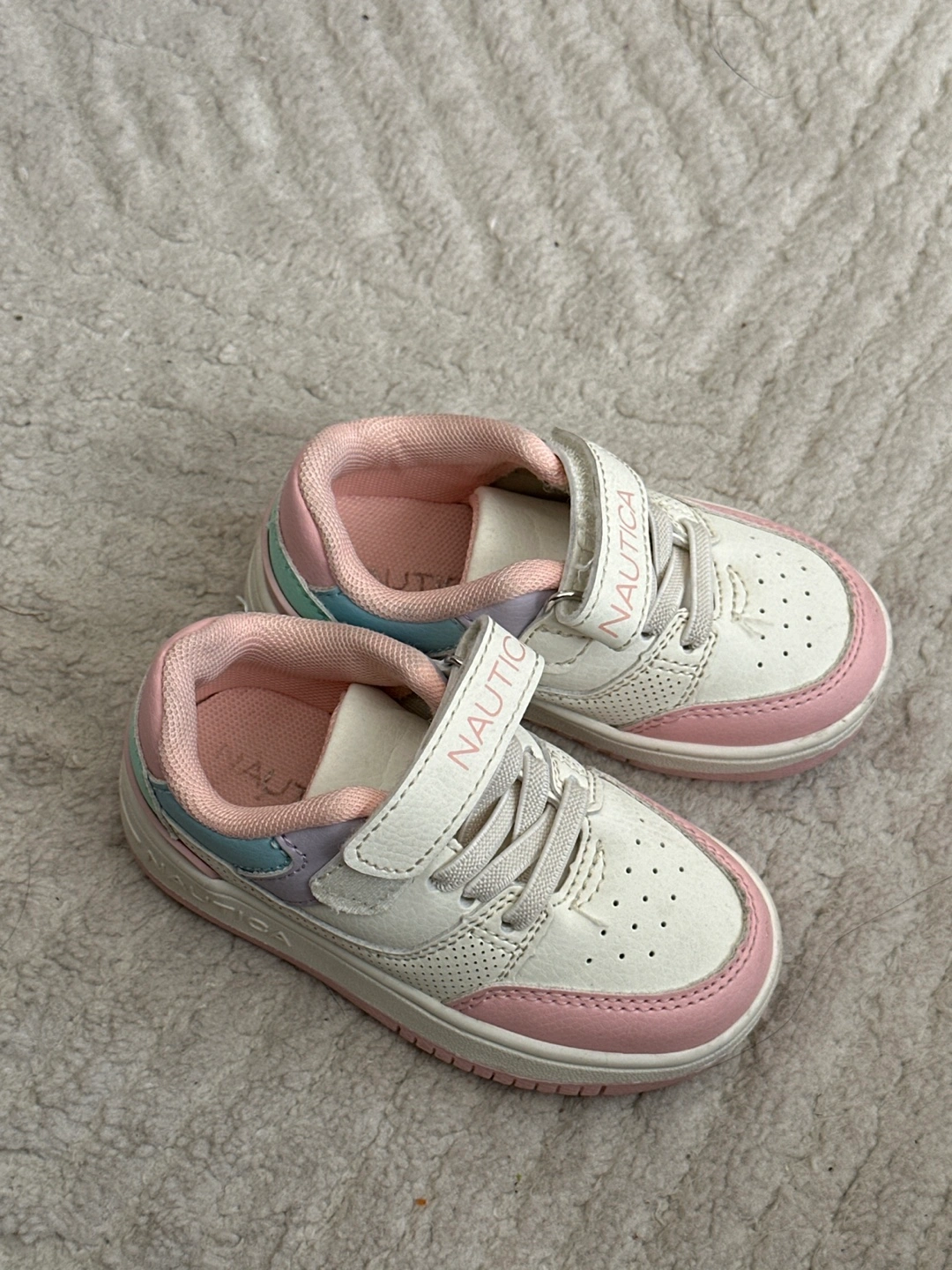 64Adorable Nautica sneakers. Pink, white, and light blue accents. Velcro and lace closure. Toddler/Little Kid size.