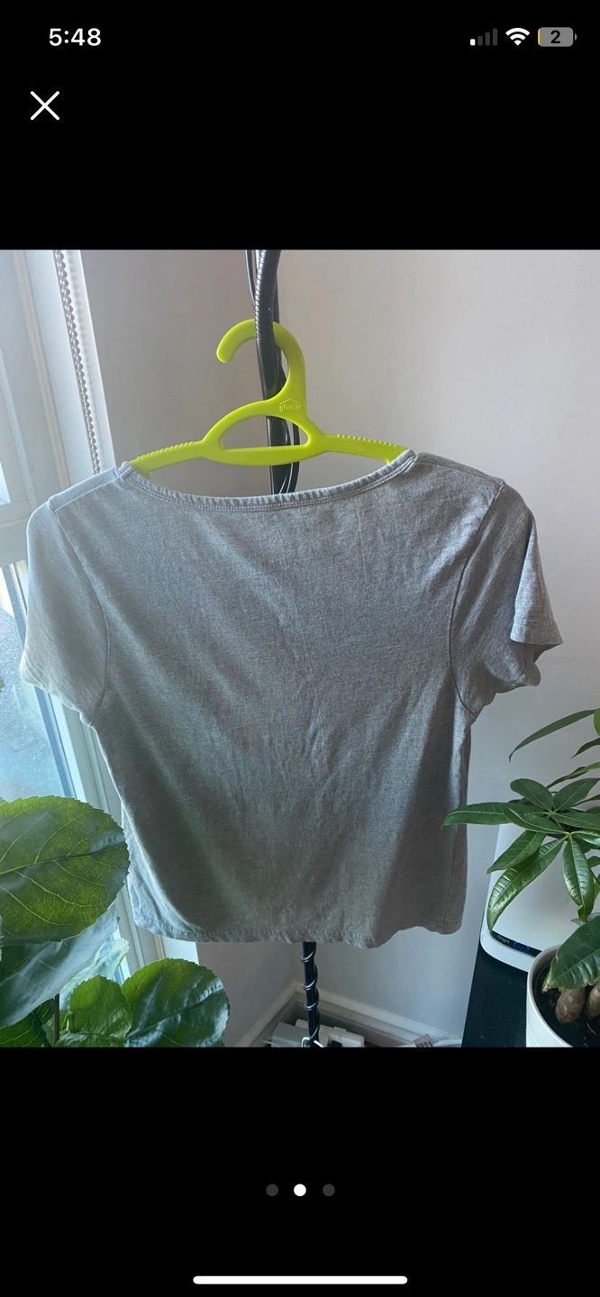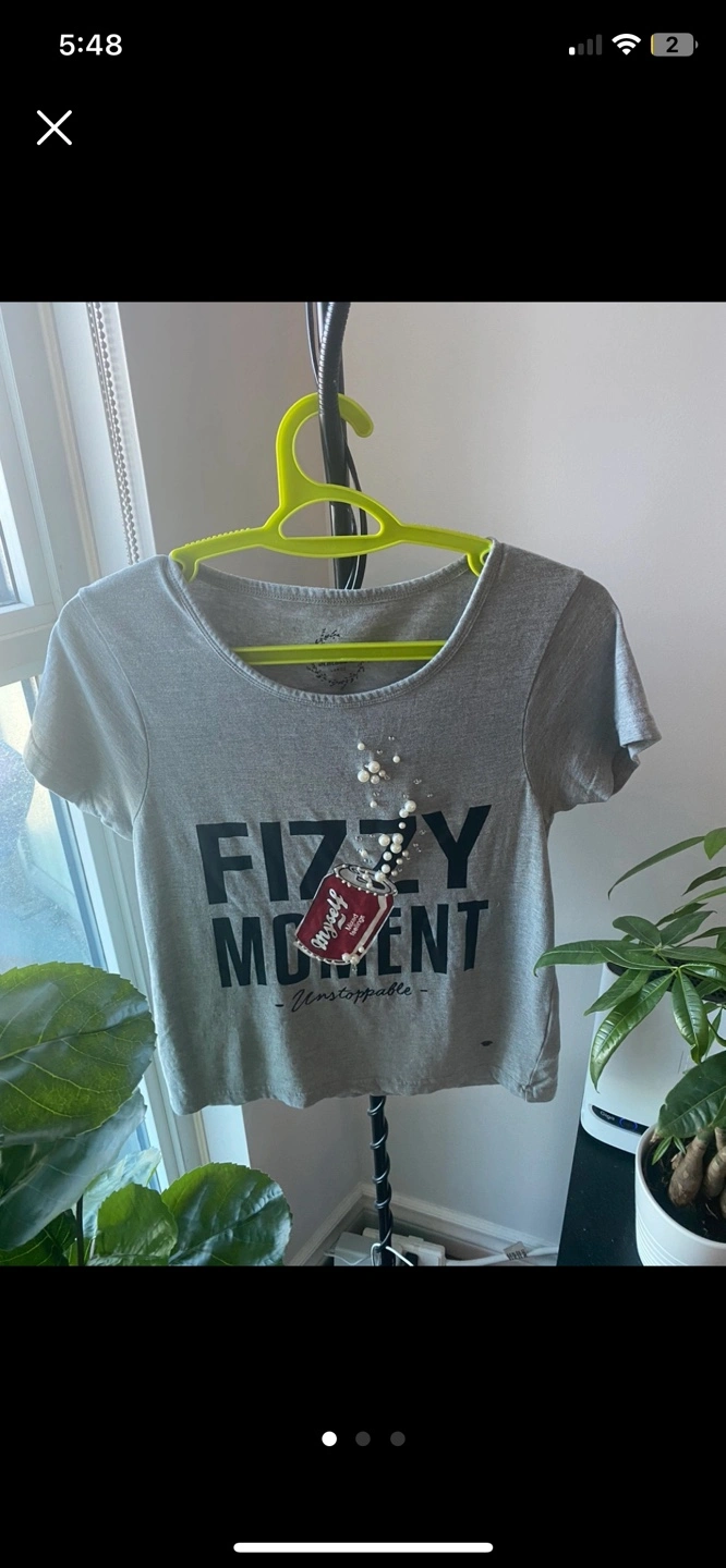 Grey cropped t-shirt. Features Fizzy Moment text and pearl embellishments. Size large. fits like medium .Short sleeves. Round neckline.