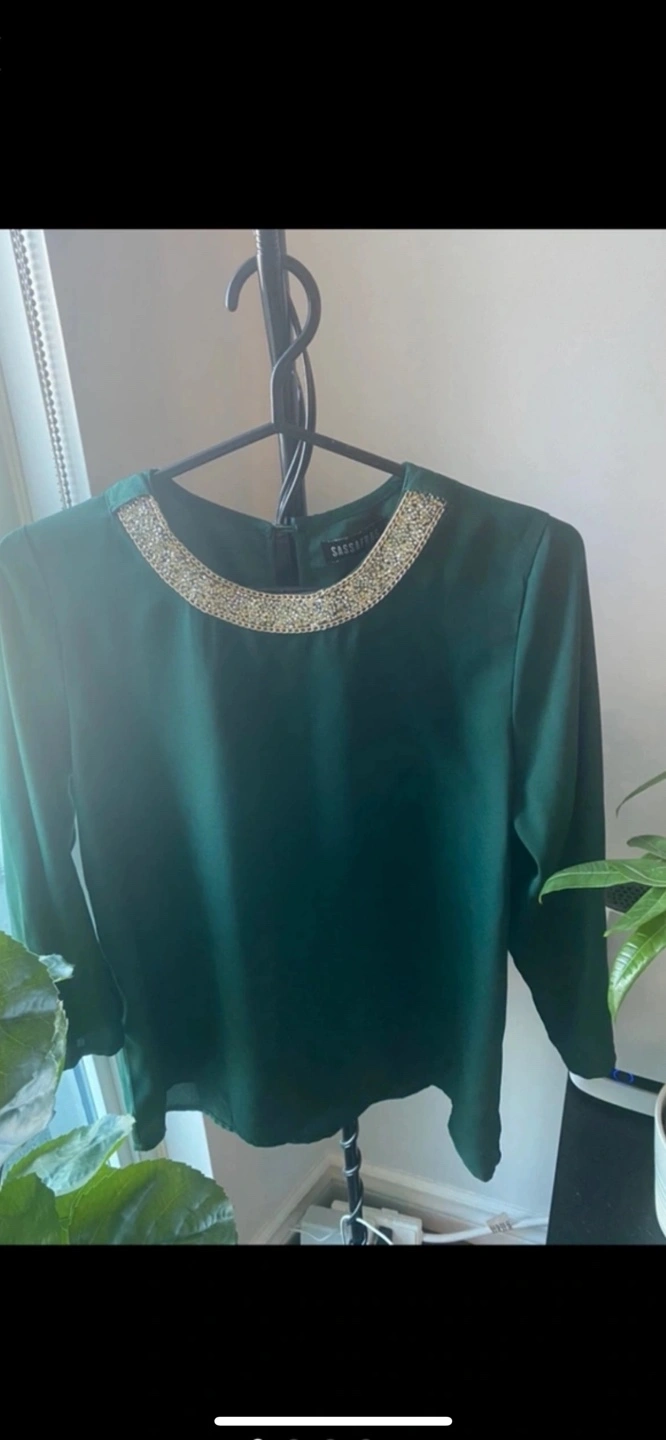 Gorgeous emerald green blouse. Features a beautiful beaded neckline. Three-quarter sleeves. Size large, fits like medium