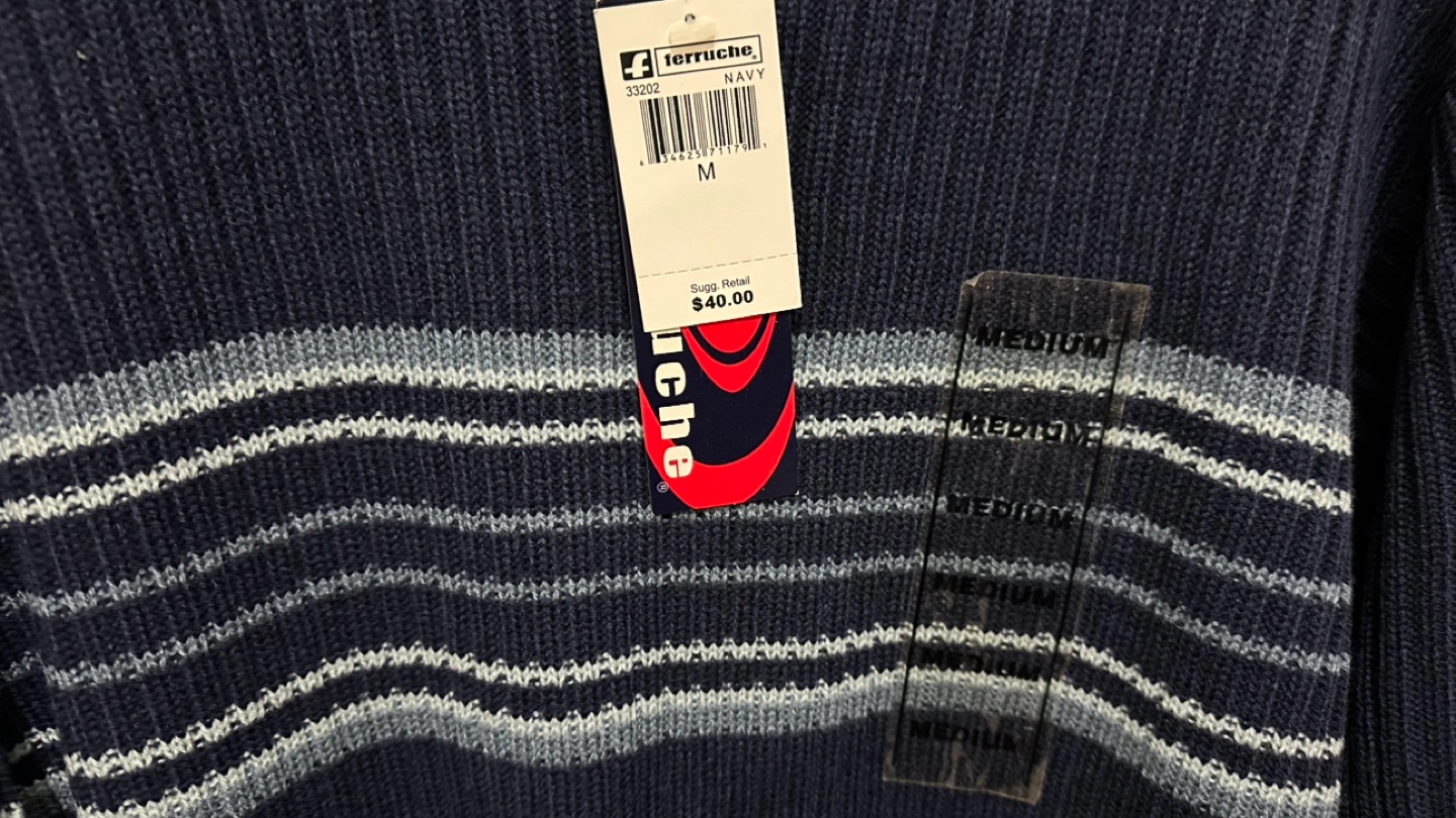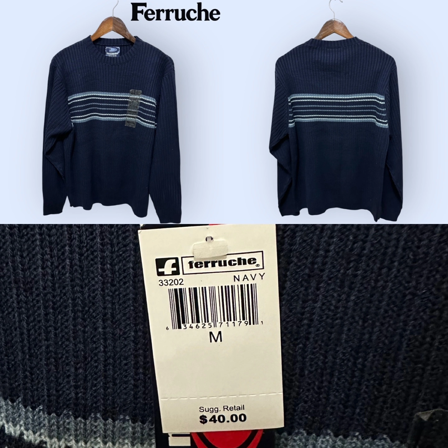 Men's medium navy blue sweater. Ribbed knit. Horizontal stripes. Long sleeves. 100% acrylic. Made in Thailand.