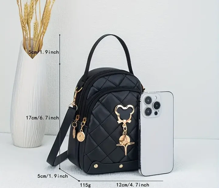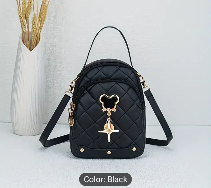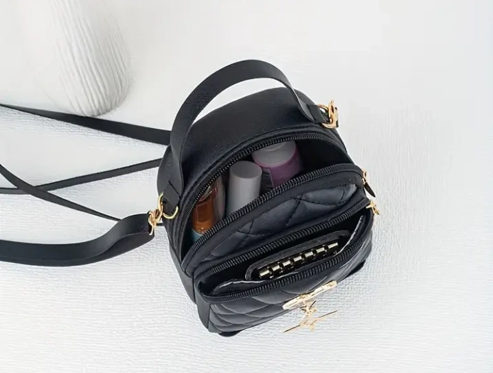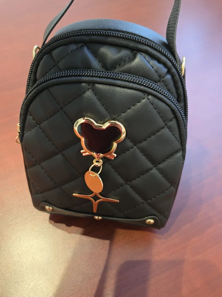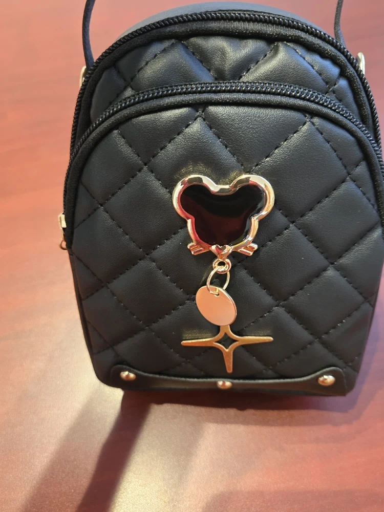 Cute black mini backpack. Features quilted design, gold-tone hardware, and adjustable straps. Small but functional, perfect for essentials. Zipper closure and multiple compartments.