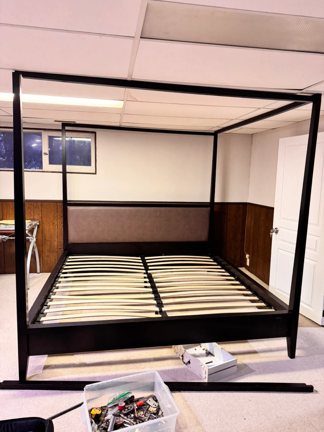 King size poster bed frame, dark brown finish. Includes headboard and slatted base.