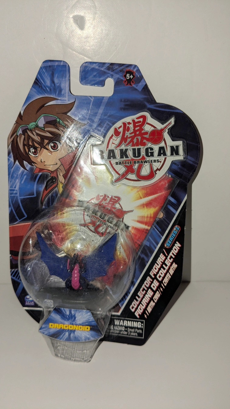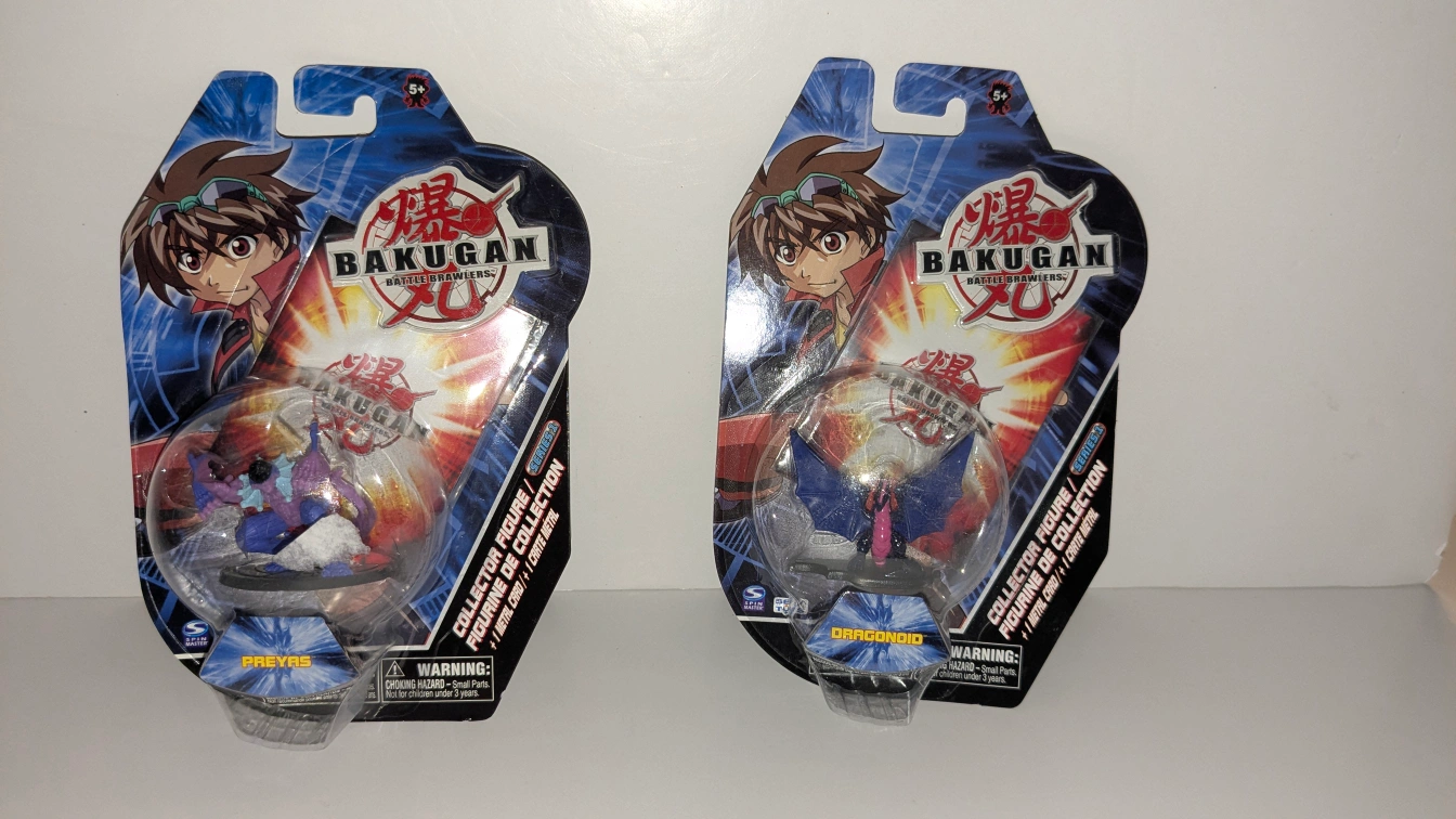 Two Bakugan Battle Brawlers collector figures. New in package. Includes one Dragonoid and one Preyas. Metal cards and collectible figures.