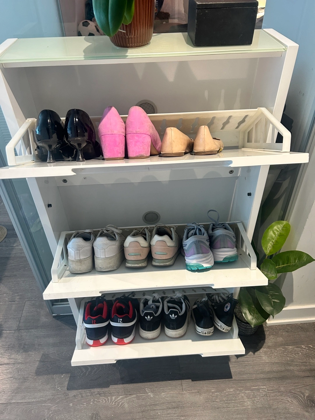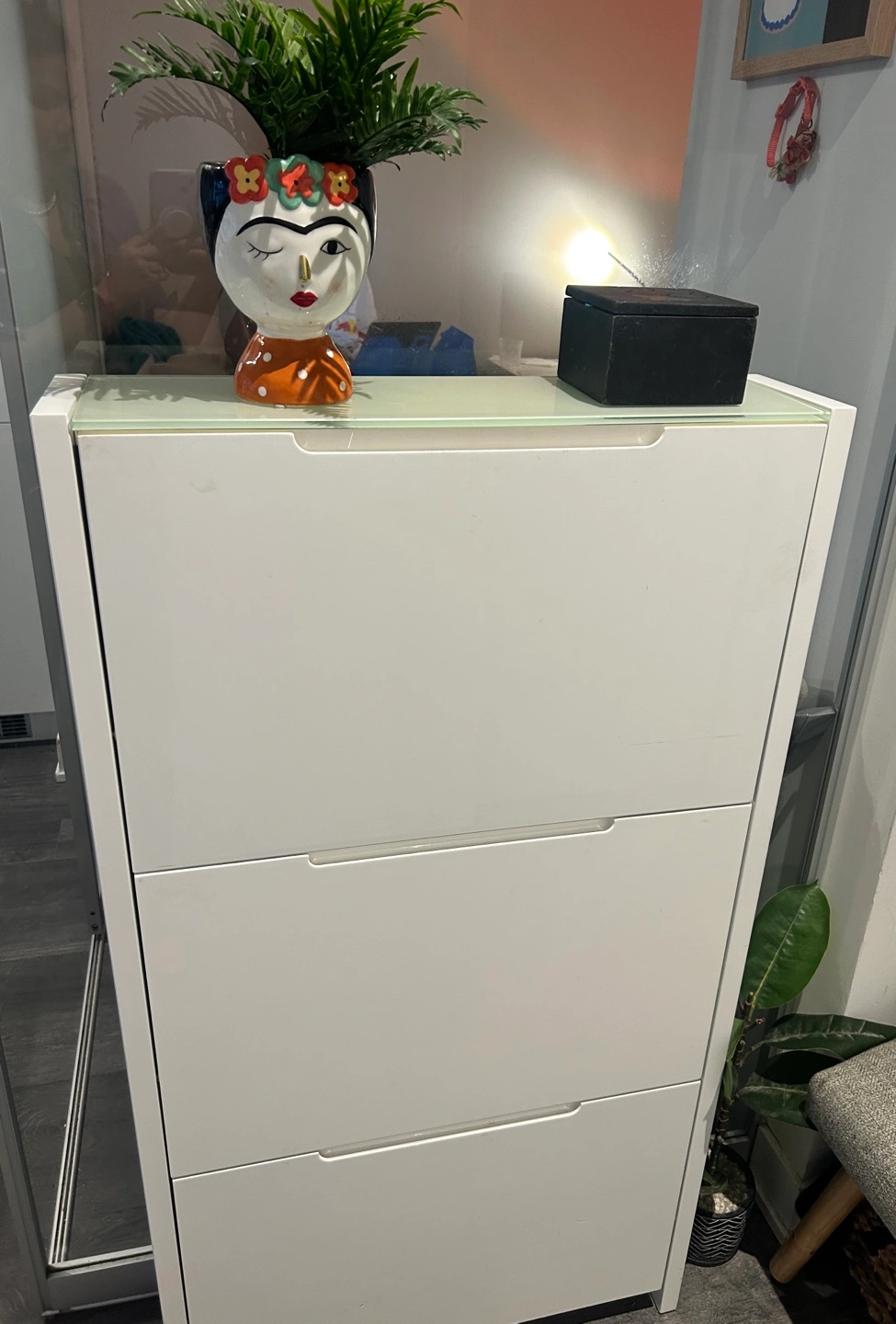 Modern white shoe cabinet. Three drawers offer ample storage. Clean lines, minimalist design. Good condition. From Structube.