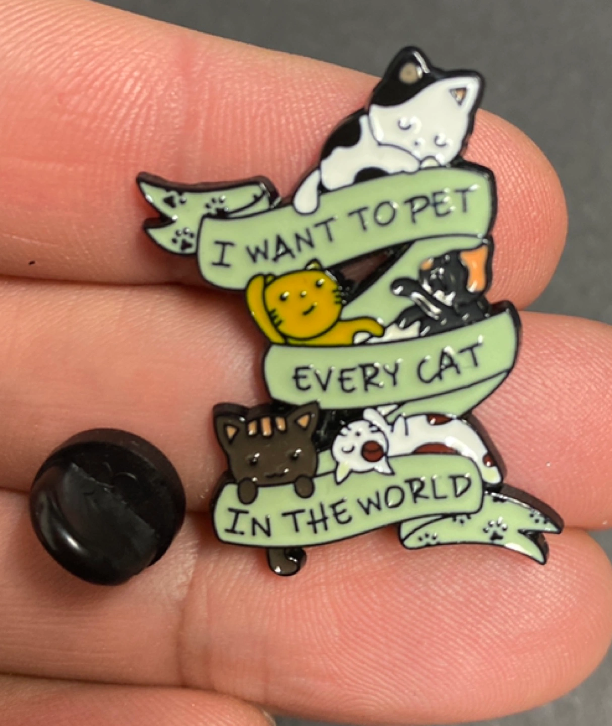 Adorable enamel pin featuring multiple cats and the phrase "I want to pet every cat in the world". Features a black metal clutch. Great for cat lovers!