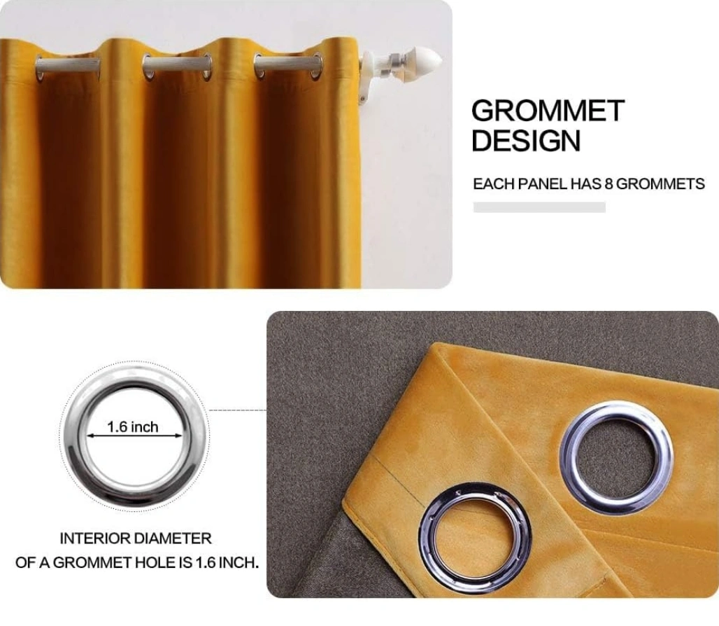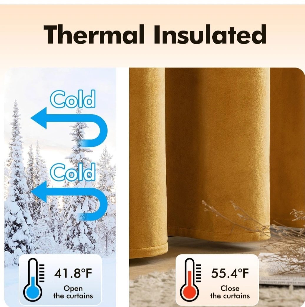 Pair of thermal insulated velvet curtains. Mustard yellow.