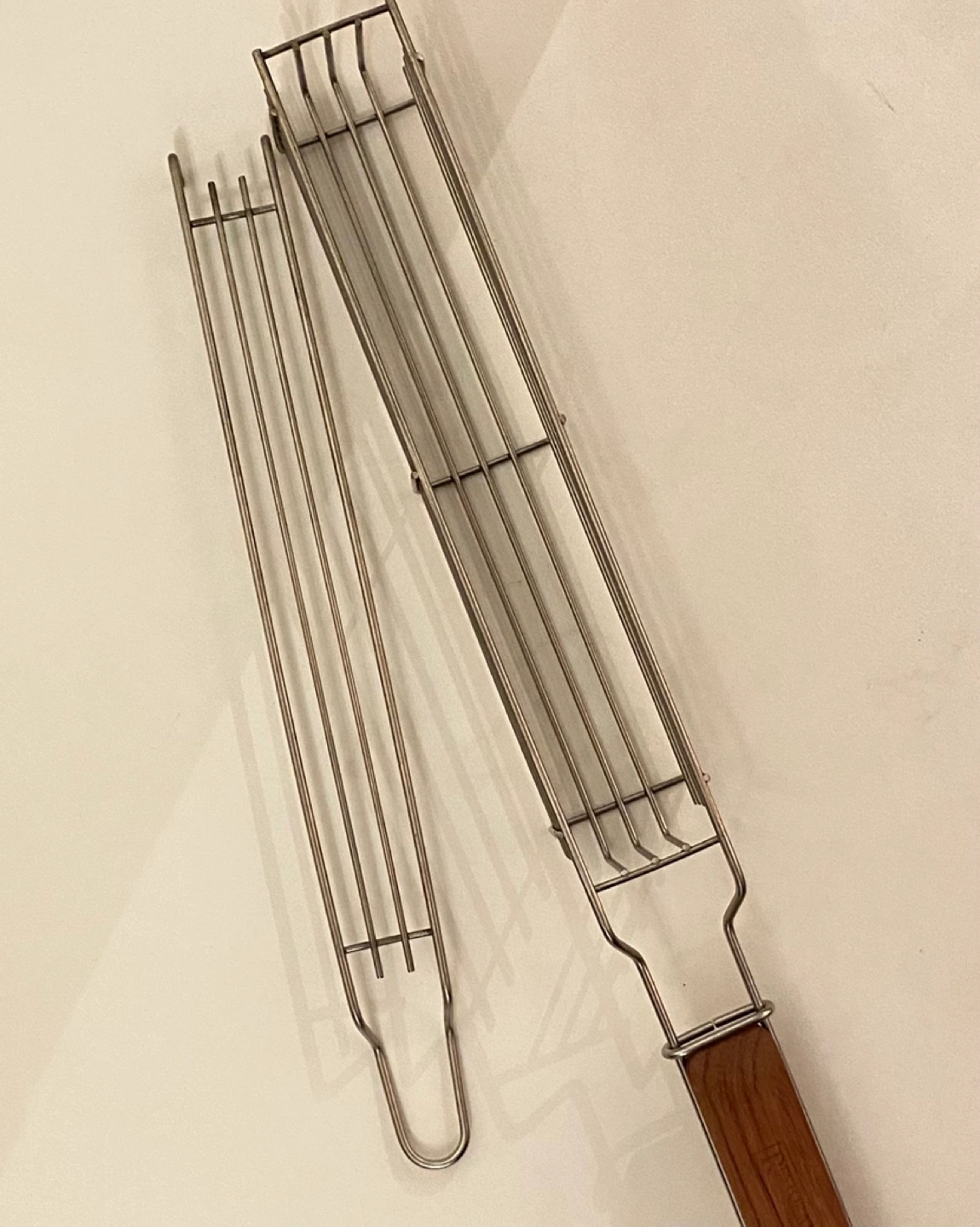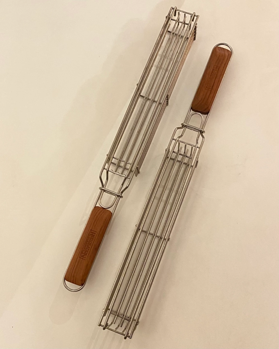 Stainless steel grill baskets. Wooden handles. Great for grilling vegetables and smaller food items.