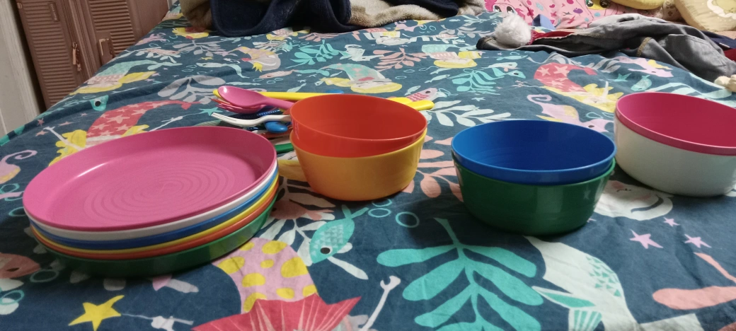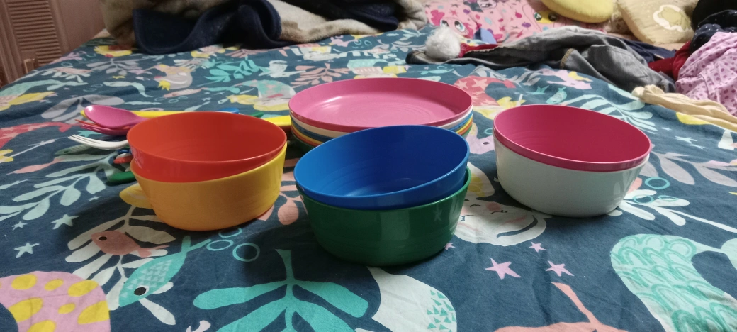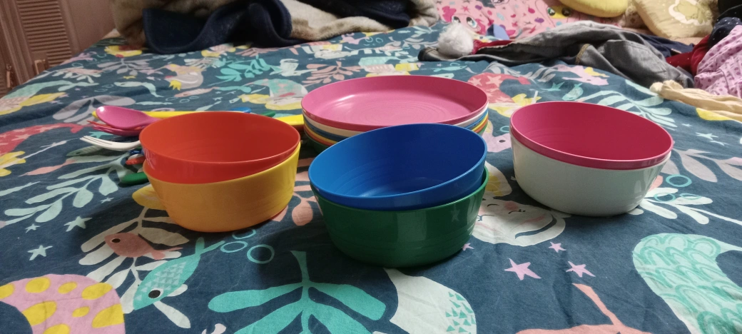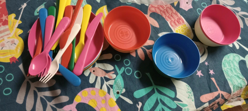564Brightly coloured plastic plates, bowls and cutlery. Perfect for toddlers and young children. Includes multiple plates and bowls in various colours. Spoons, forks and knives also included.its ikea brand