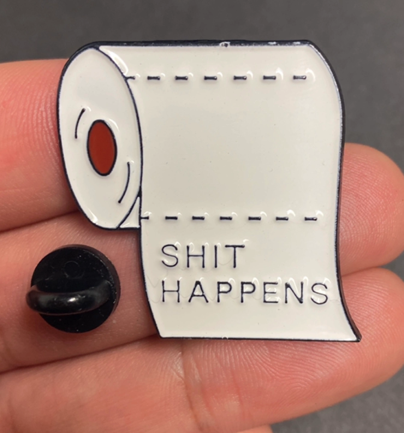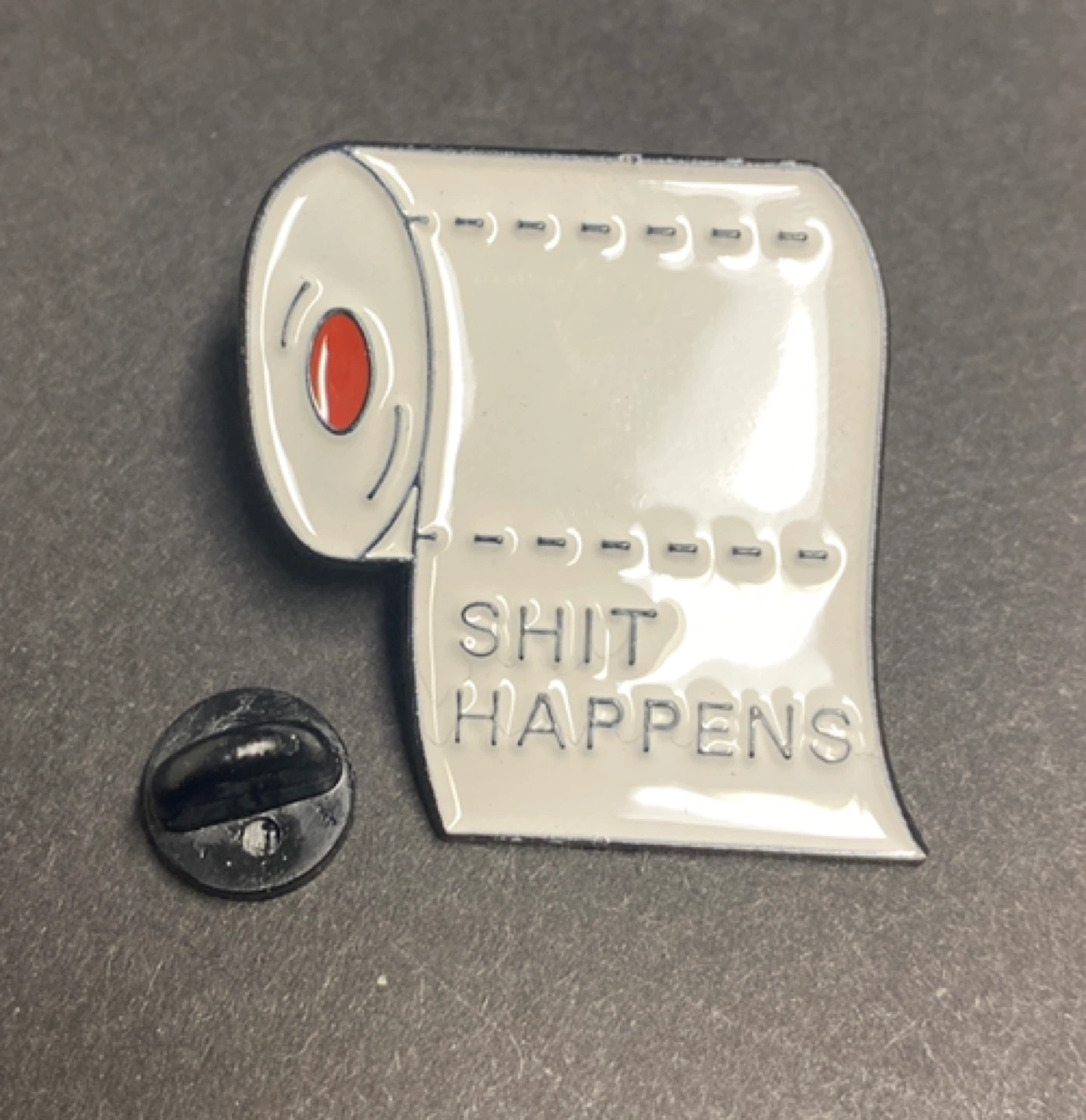 Funny enamel pin featuring a roll of toilet paper and the phrase "Shit Happens". Great for backpacks, jackets, or hats. Includes a black rubber clutch back.