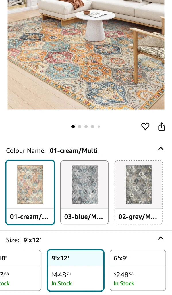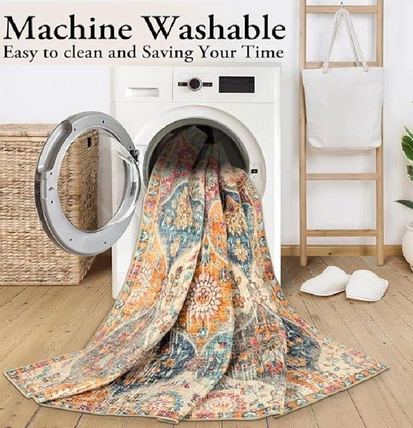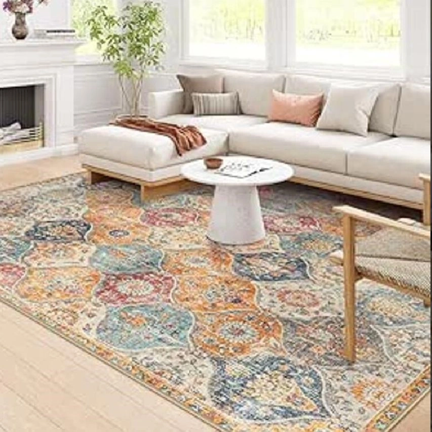 Beautiful area rug, 9x12 feet. Cream base with multicolored pattern. Machine washable for easy cleaning. Perfect for living room or dining room.