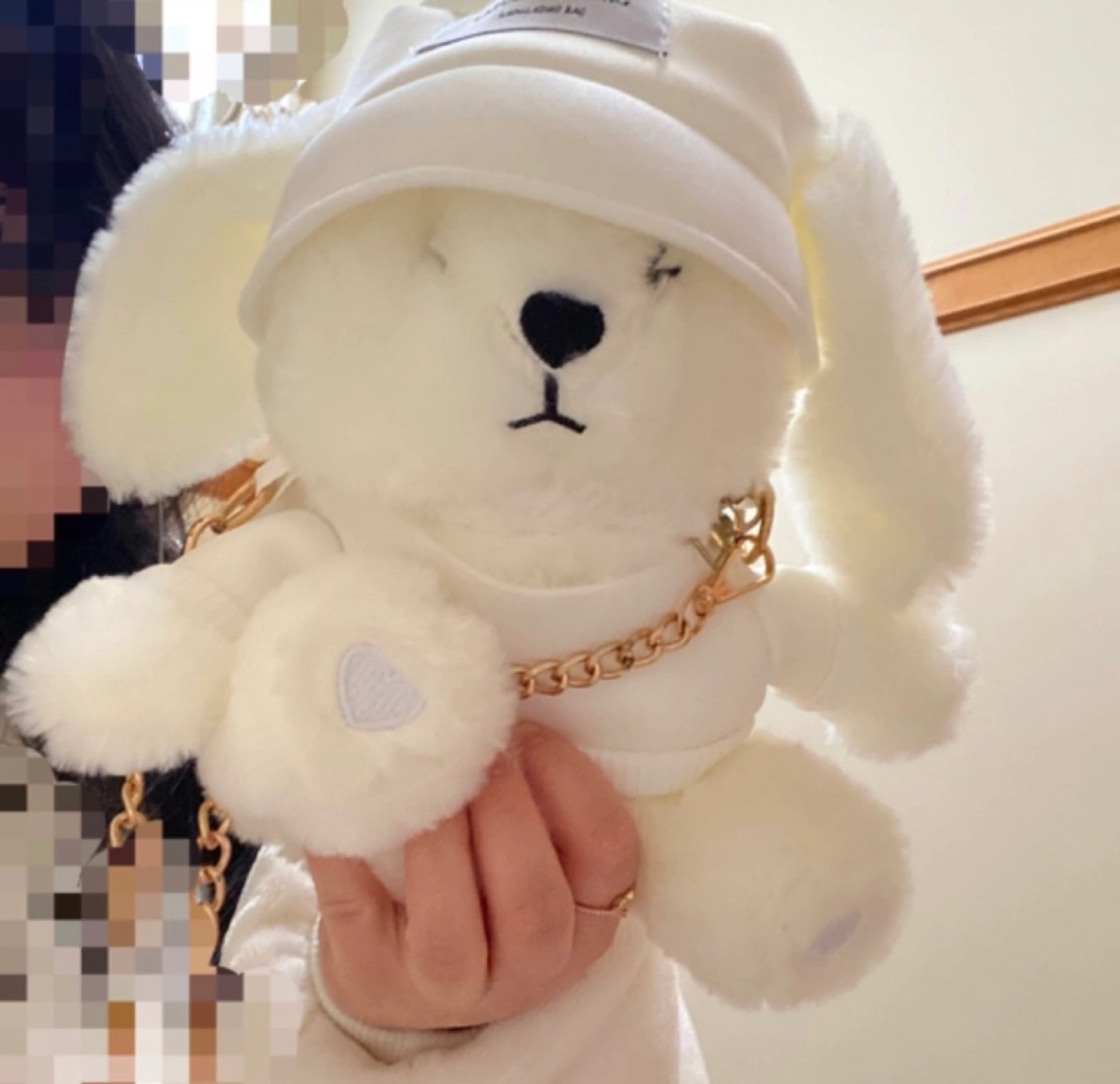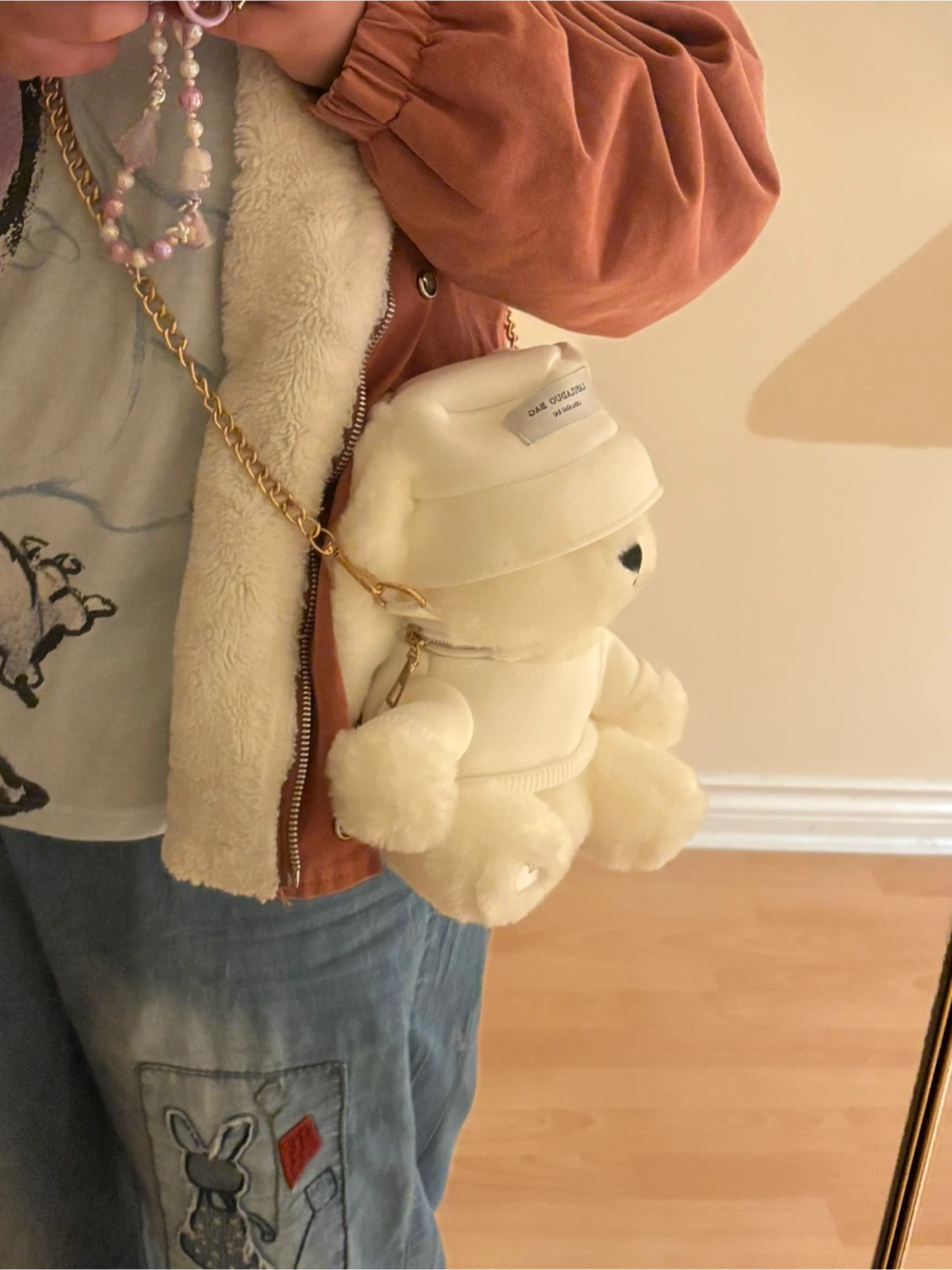 Cute doggy shaped bag. Features soft plush material, a white hat, and gold chain strap. Small zipper closure. Perfect for carrying essentials. It’s like a doggy shopping with you.