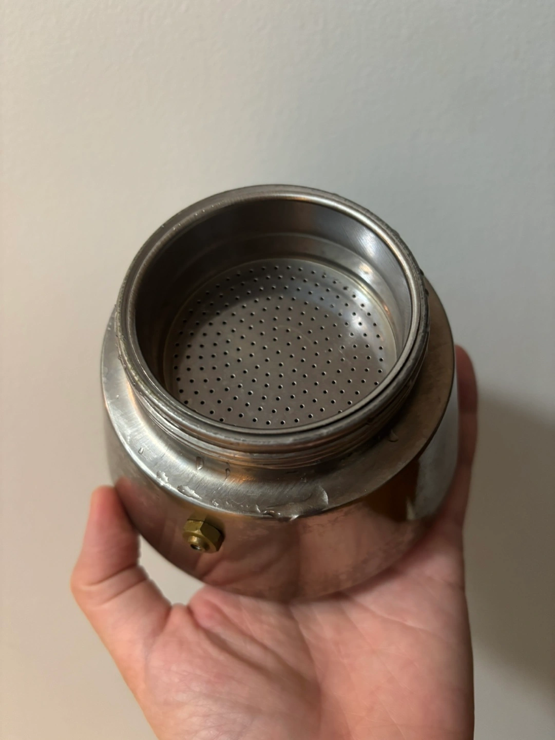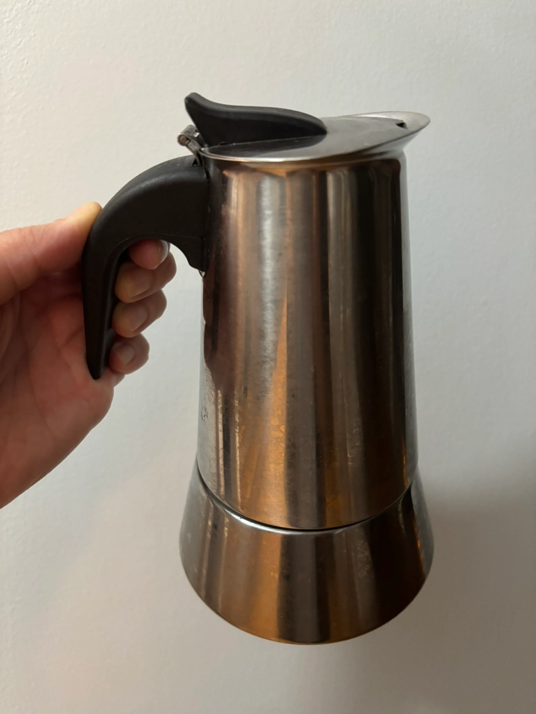 Used stovetop espresso maker. Stainless steel construction. Black plastic handle and lid. Small and portable. Makes delicious espresso.