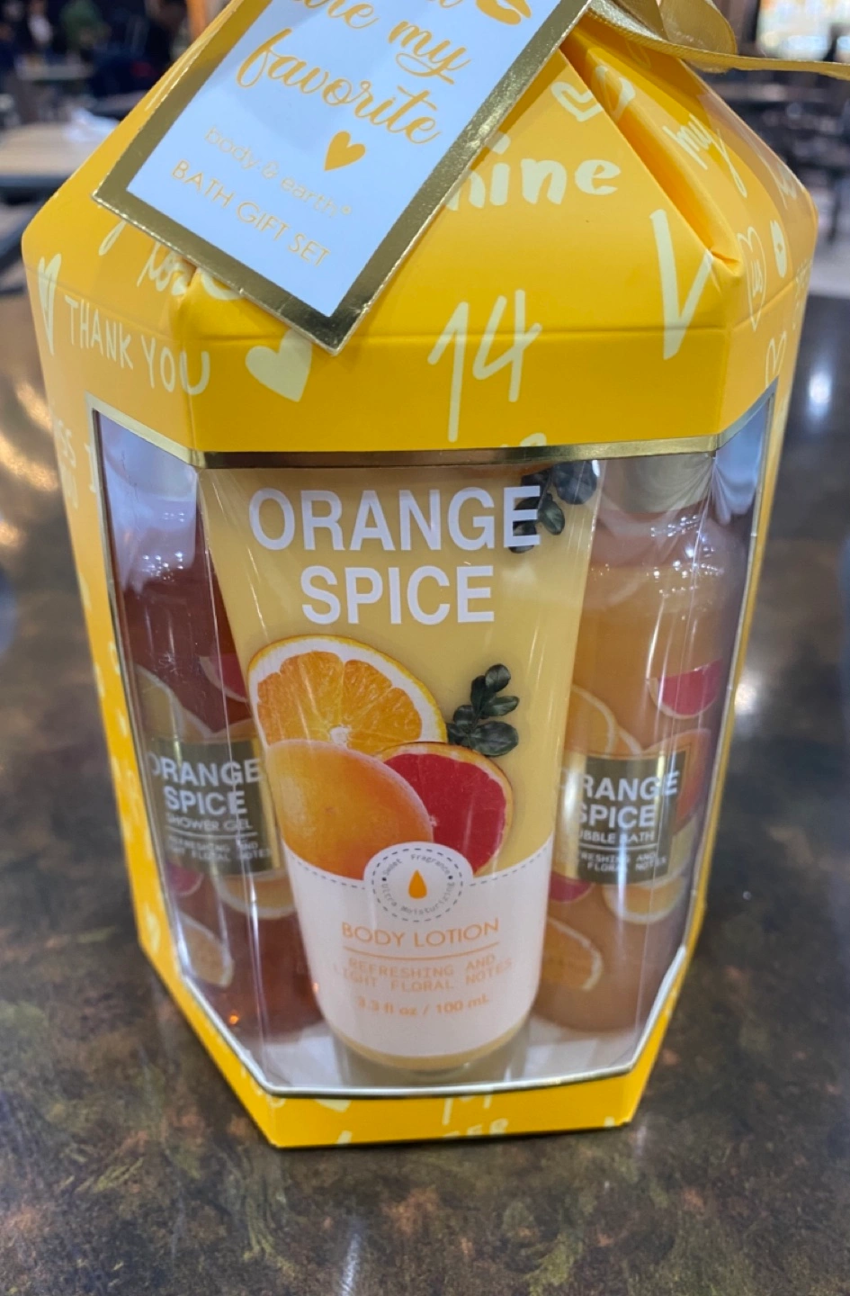 New, unused Orange Spice bath gift set. Includes shower gel, bubble bath, and body lotion. Refreshing and floral notes. Cruelty-free.