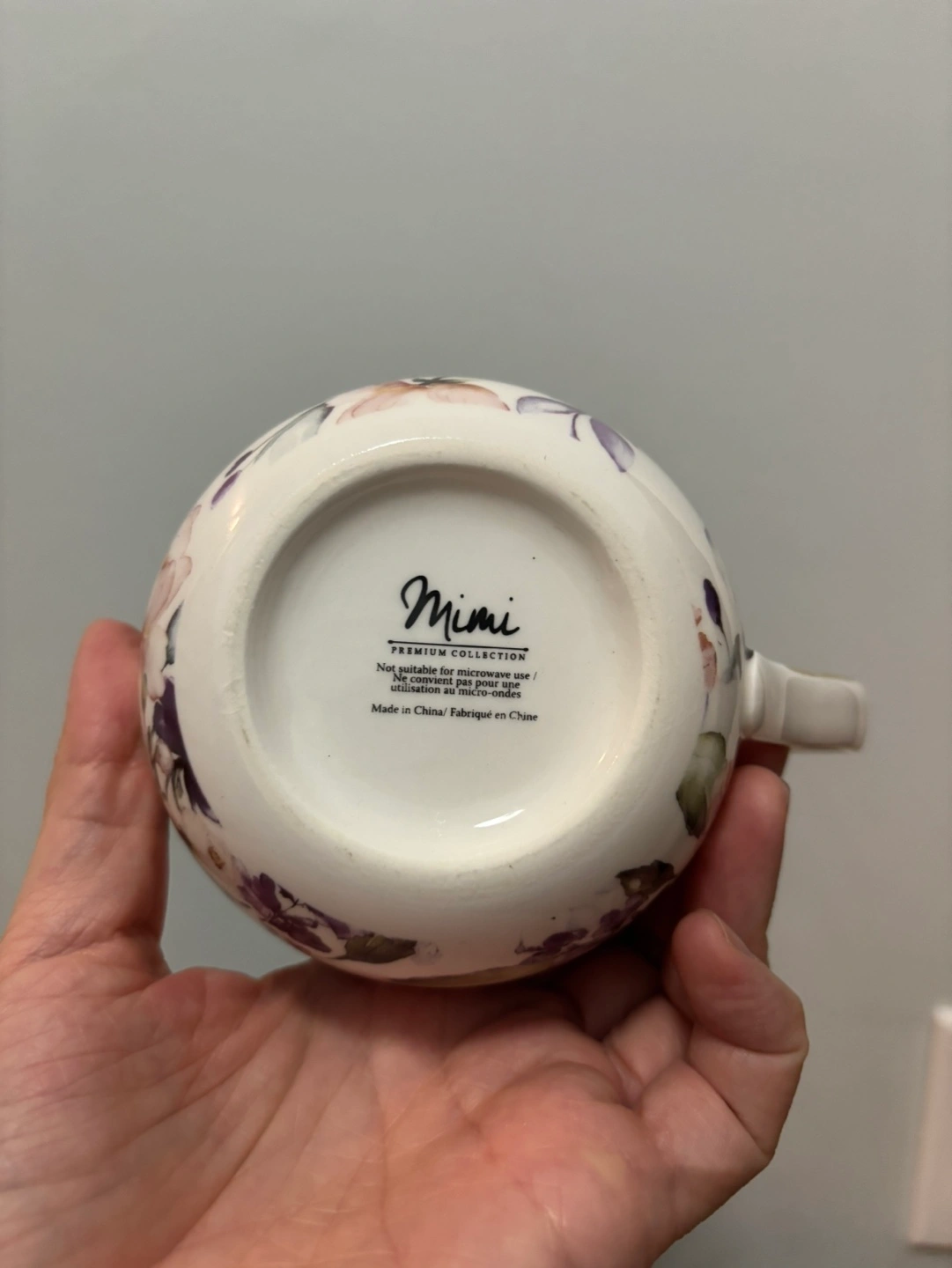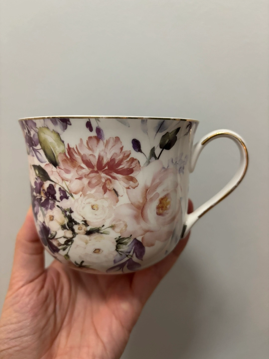 Pretty floral tea mug. Features a beautiful watercolour floral design. Gold-trimmed handle and rim. Not microwave or dishwasher safe.