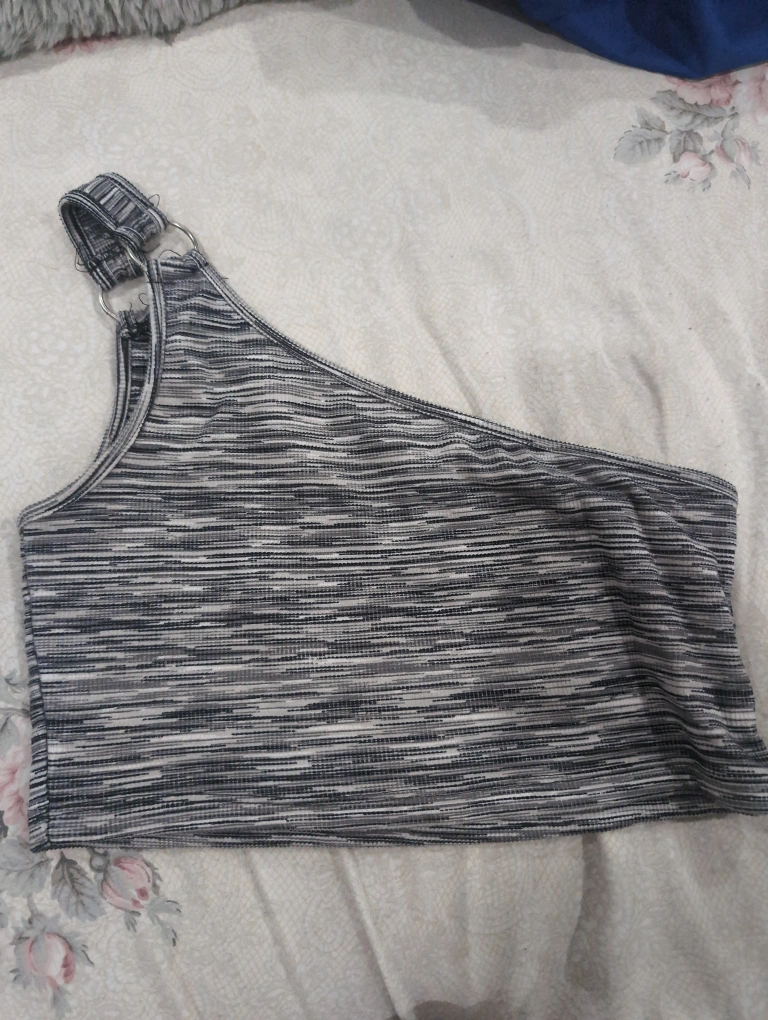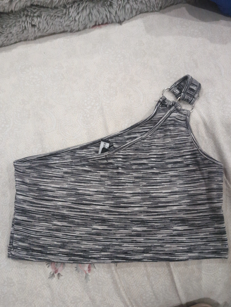 Grey and black striped one shoulder crop top. Features a silver ring detail. Lightweight and stretchy material. Excellent for layering or wearing on its own.