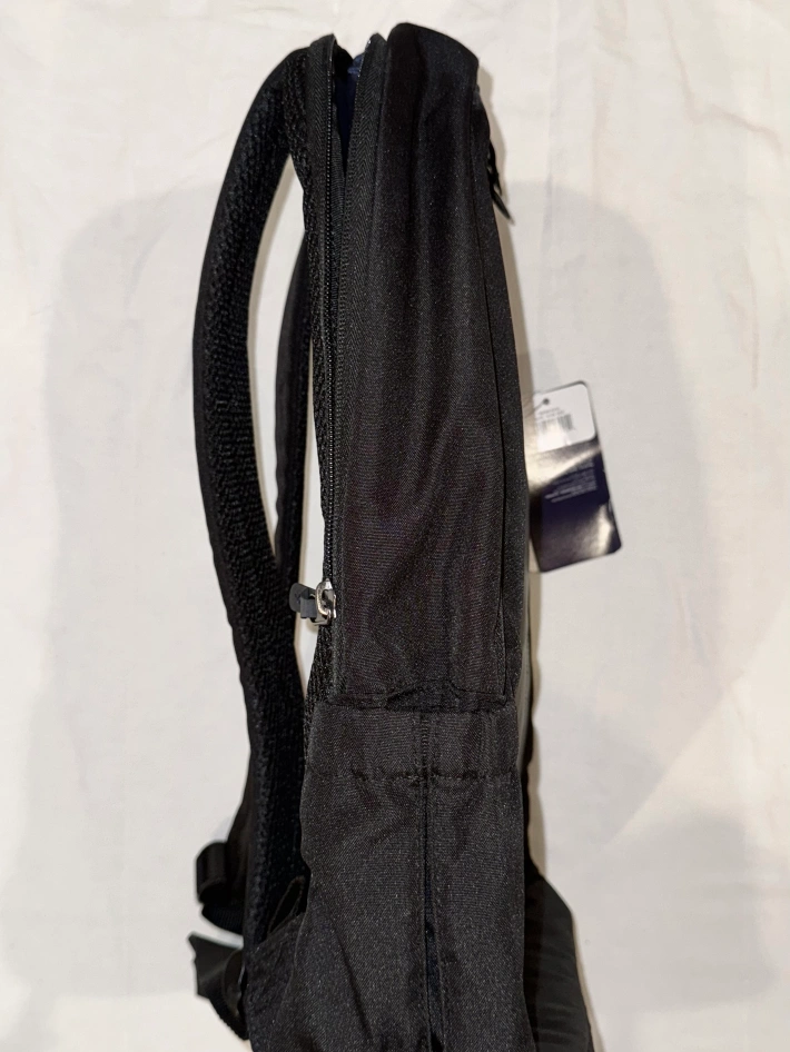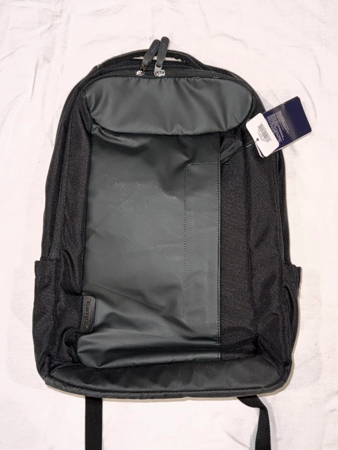 Black laptop backpack. Multiple compartments. Comfortable padded straps.