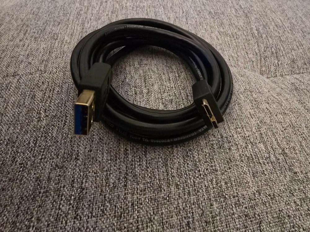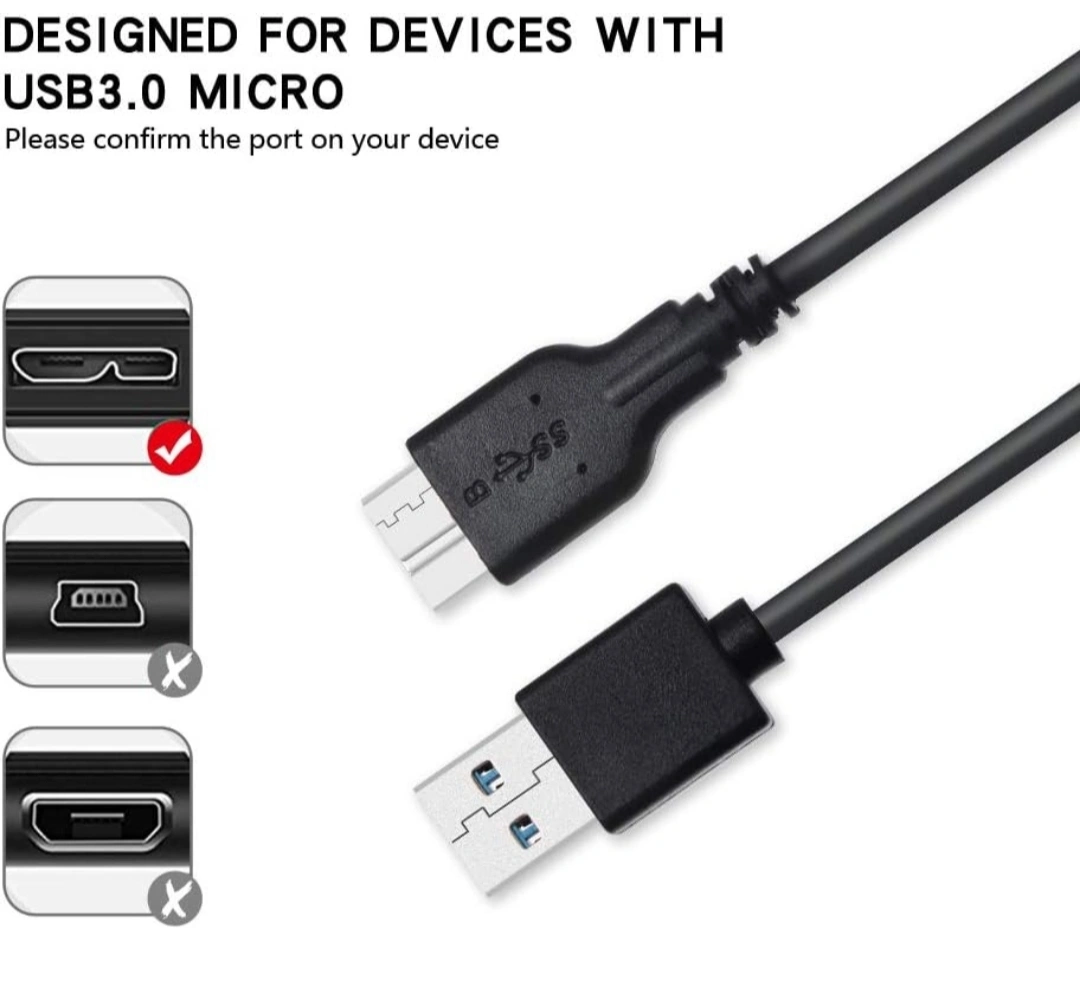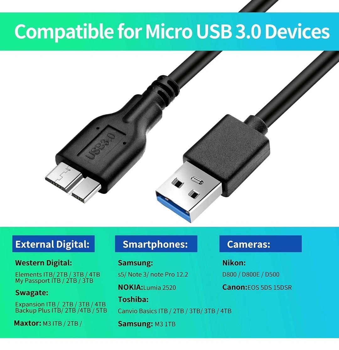 1000+Black USB 3.0 cable. Connects Micro-B devices to USB-A ports. Fast charging and data syncing. Compatible with various cameras, and external hard drives.