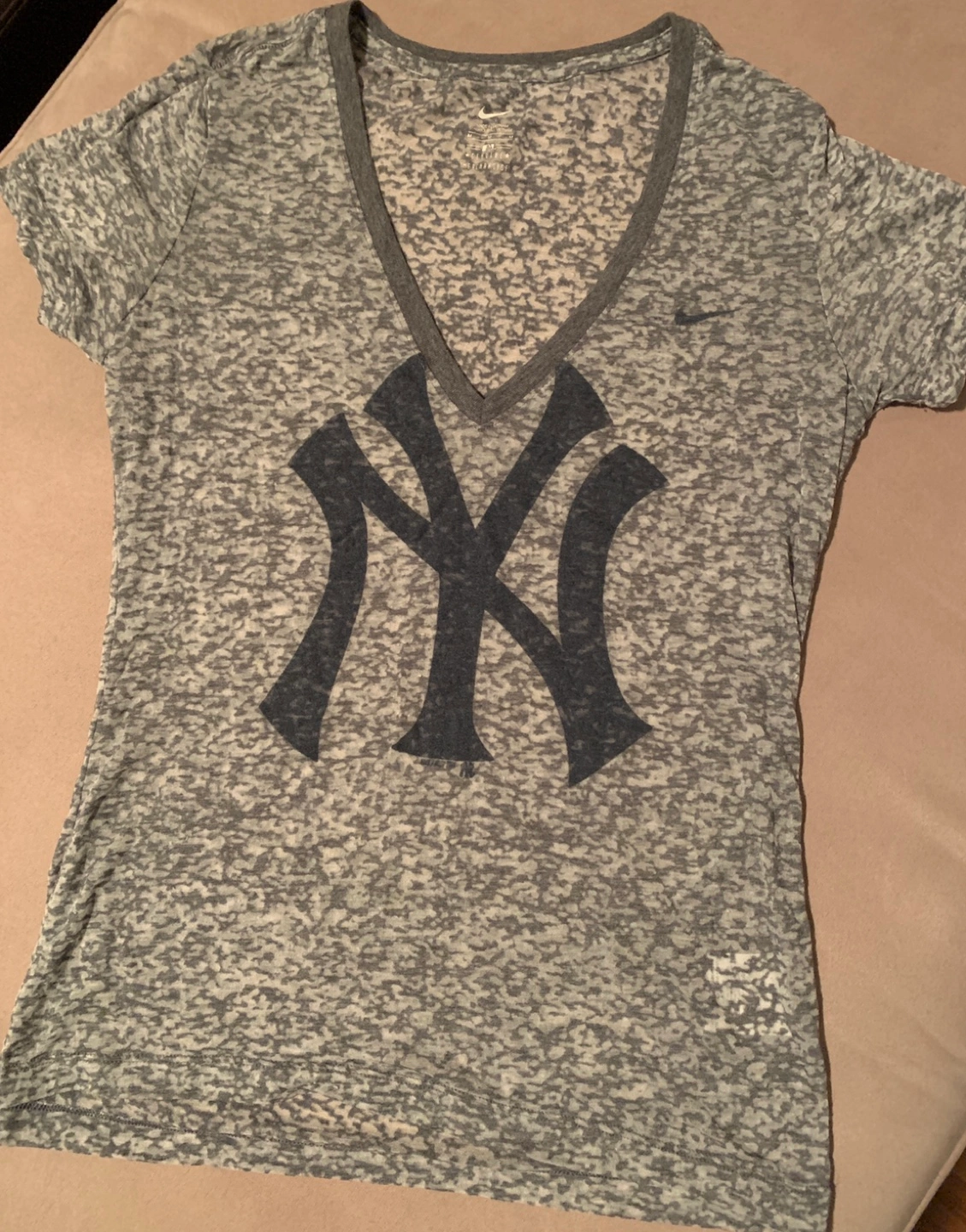Grey heather v-neck t-shirt. Features New York Yankees logo. Short sleeves. Lightweight material.