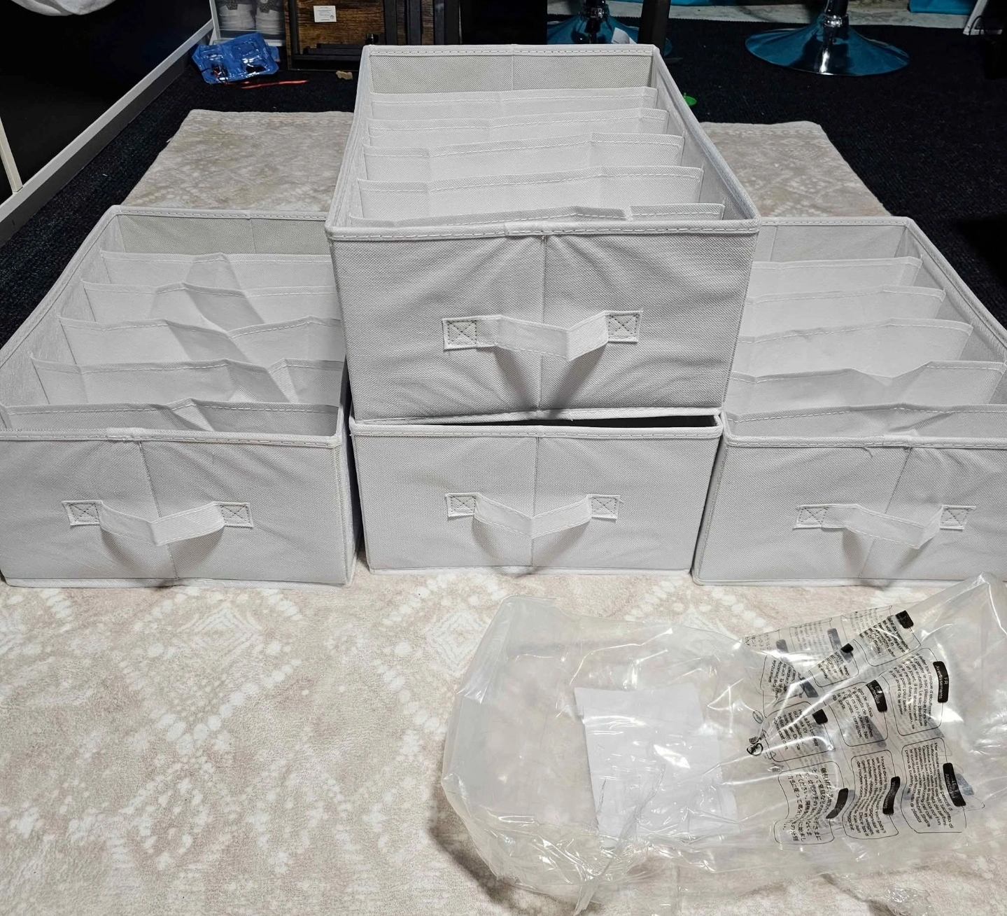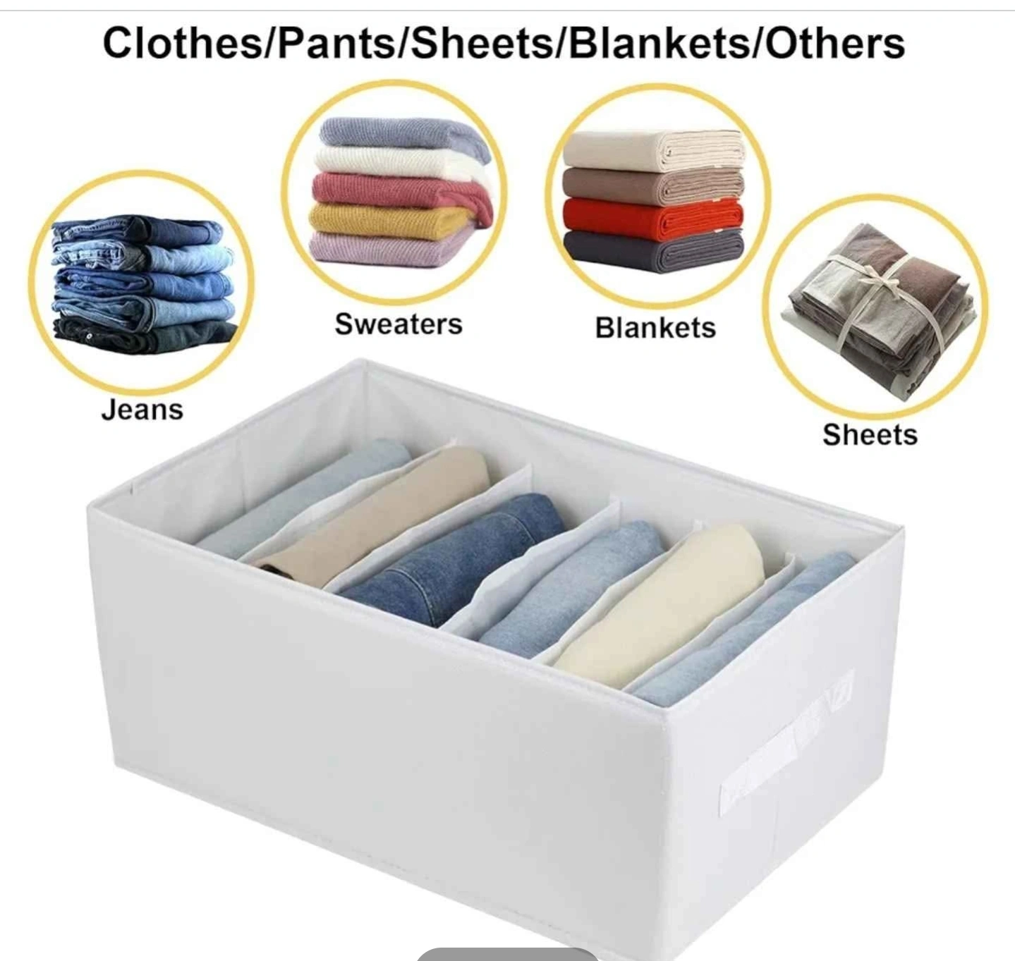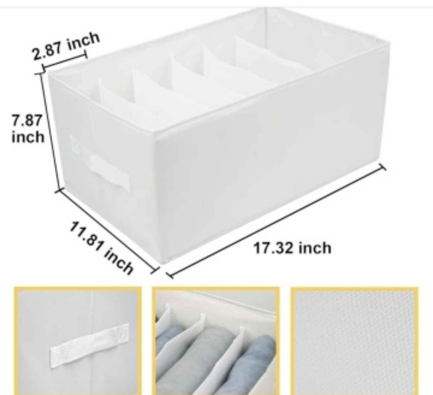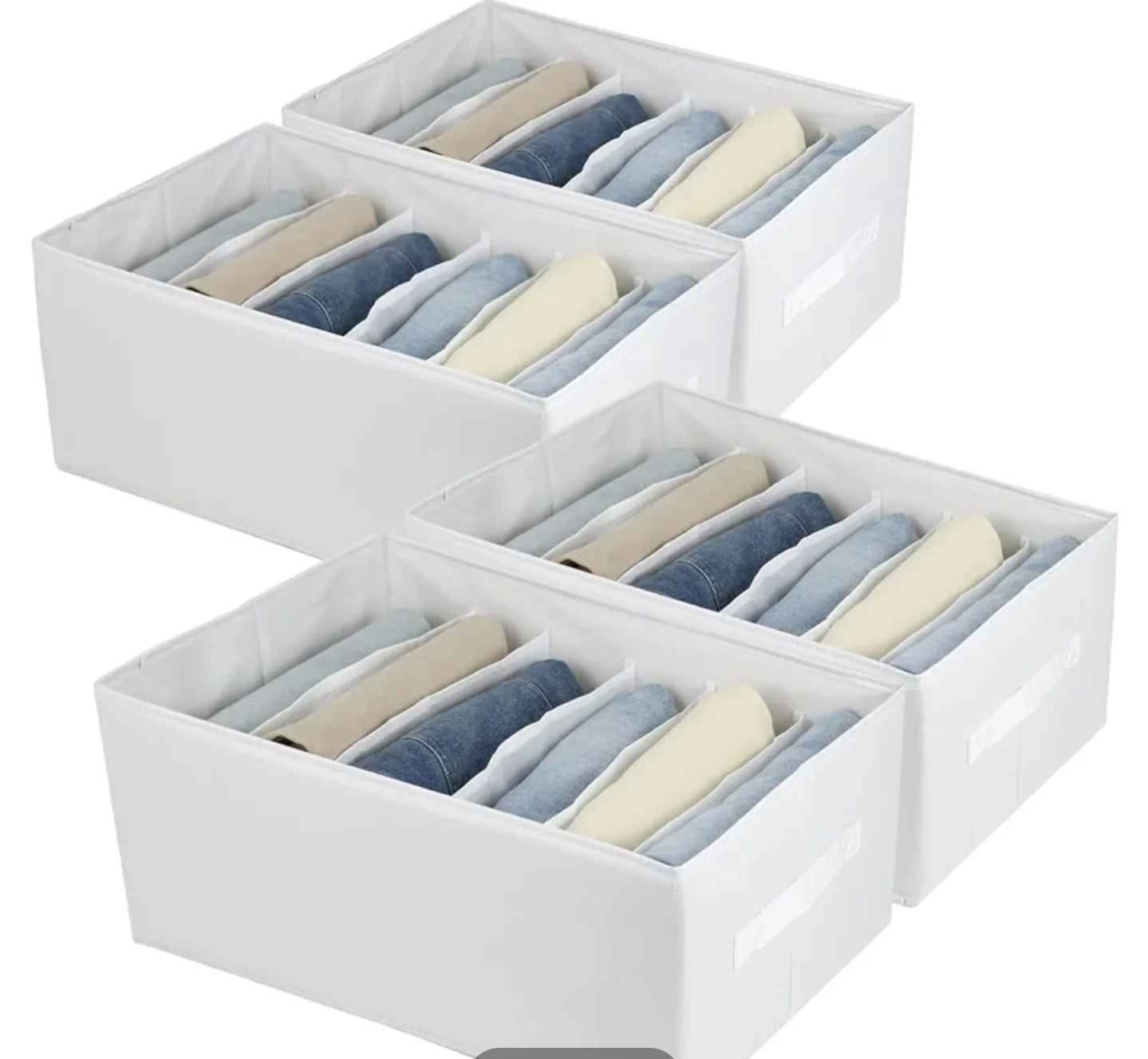 87Four white fabric drawer organizers. Great for storing clothes, sweaters, jeans, and more. Foldable for easy storage. Measurements provided in images.