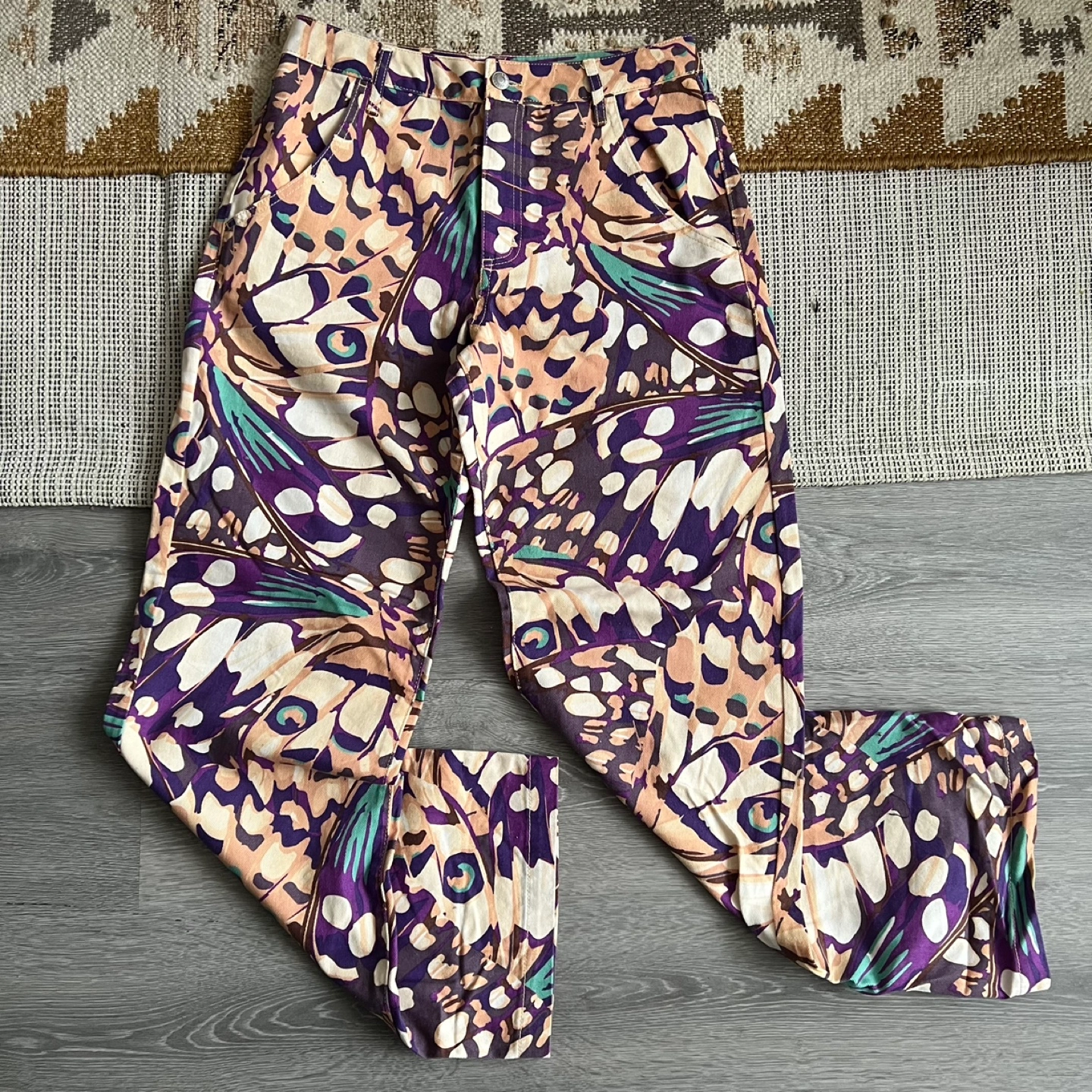 Women's size medium pants. Features a vibrant butterfly print. Button and zip closure. Wide leg pant