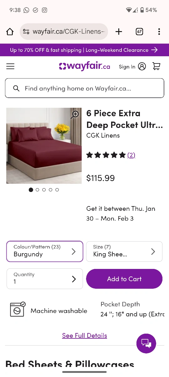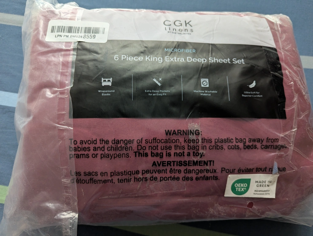 Brand new, burgundy king-size sheet set. Six pieces, extra deep pockets. Machine washable. Microfiber material. Superior comfort. Wrap-around elastic.