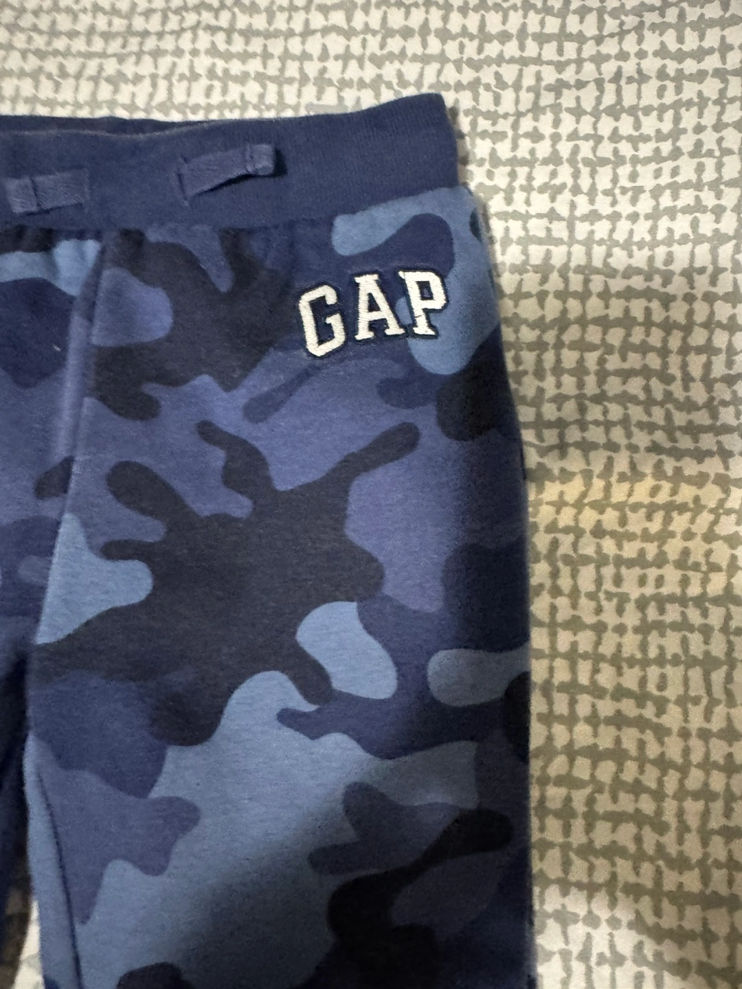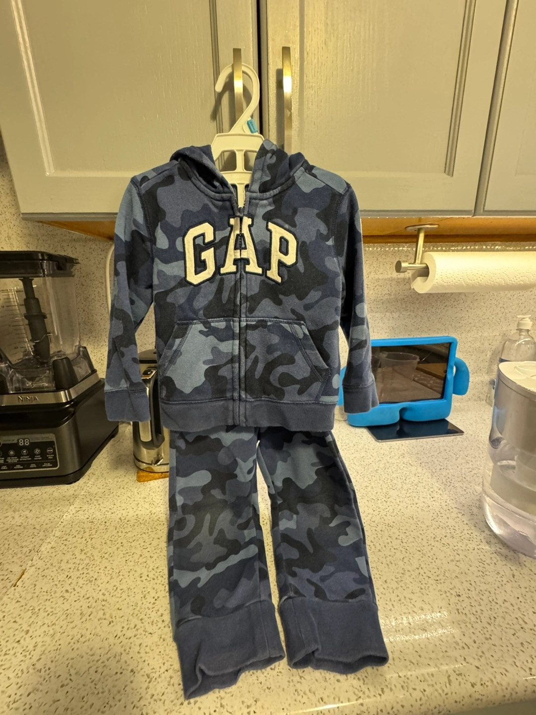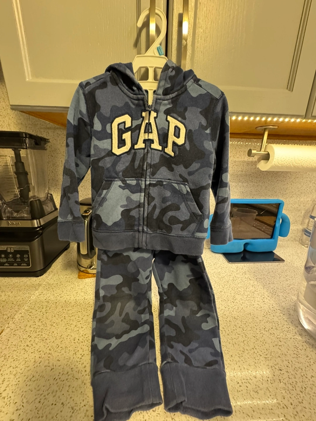 Adorable baby boy's outfit. Blue camo print. Soft material. Includes a zip-up hoodie and matching joggers. Perfect for playtime.3 years old