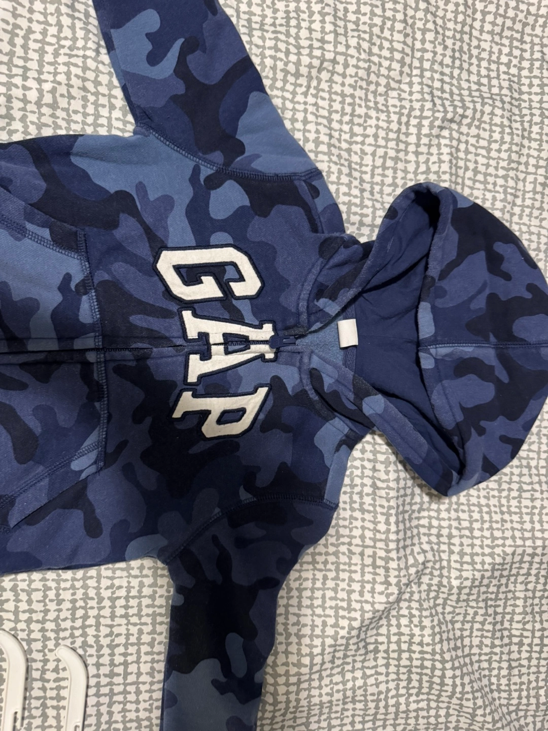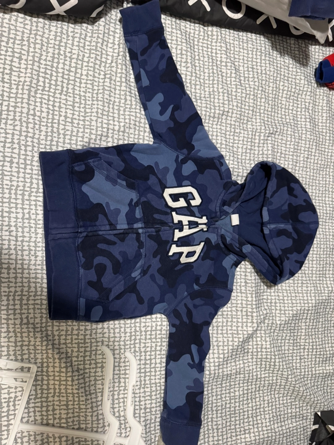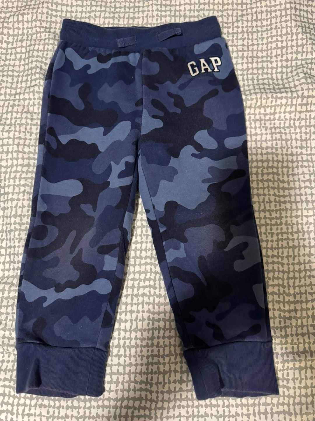 Adorable baby boy's outfit. Blue camo print. Soft material. Includes a zip-up hoodie and matching joggers. Perfect for playtime.3 years old